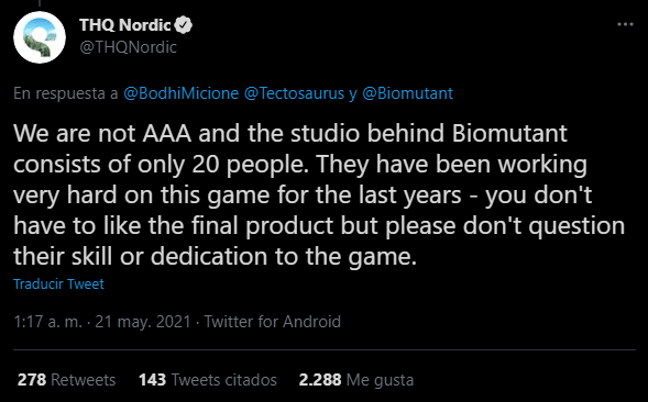 "No trabajamos en calidad de AAA y el estudio tras Biomutant consiste solamente de 20 personas. Han estado trabajando muy duro en este juego durante estos últimos años - no tiene que gustarte el producto final, pero por favor no cuestiones su capacidad o dedicación respecto al juego."