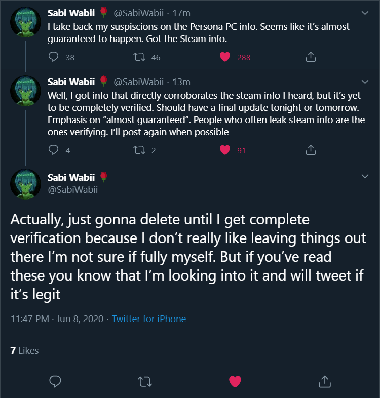 Como podemos comprobar, SabiWabii optó por eliminar sus sospechas respecto al lanzamiento de Persona en Steam hasta que su información estuviera totalmente verificada. Pese a ello, podemos apreciar que menciona que "está casi completamente garantizado que vaya a ocurrir". Al fin y al cabo, a día de hoy a excepción de una mención a Shin Megami Tensei V o Project Re Fantasy lo cierto es que la desarrolladora no cuenta con otra IP más allá de Persona que verdaderamente pudiera suponer una gran sorpresa para los amantes de los videojuegos.