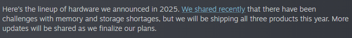 Steam publicó recientemente una versión actualizada de su informe anual, que confirma algunos planes importantes para el próximo año. La compañía confirmó que los tres productos previstos para 2026 siguen programados para su lanzamiento antes de fin de año, incluyendo la Steam Machine, un rediseño del Steam Controller y el Steam Frame, centrado en la realidad virtual. Steam abordó la persistente escasez de memoria y almacenamiento que ha afectado a la industria en la publicación, citando desafíos no específicos que han surgido como resultado. Steam también reiteró sus afirmaciones previas sobre la potencia de la Steam Machine, que es seis veces superior a la de la Steam Deck.