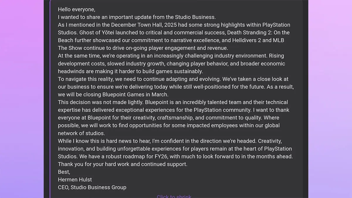 Están lloviendo críticas sobre los directivos de la compañía tras las noticia del cierre de Bluepoint: así es como Helmen Hurst, máximo responsable de PlayStation Studios, lo anunciaba dentro de la empresa