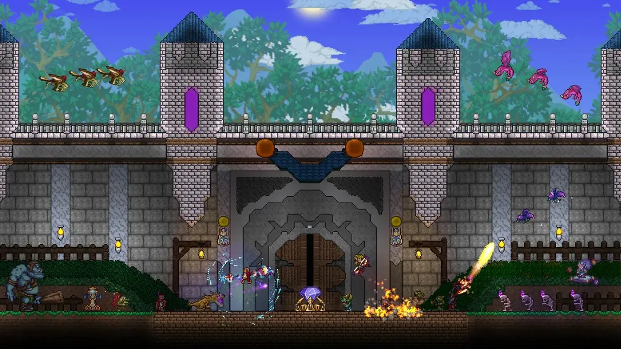 Todos los ejemplos anteriores eran juegos en 3D, ¿verdad?, pues aquí tienes uno de los juegos de supervivencia más míticos de la historia en 2D: Terraria. Lo más fácil para entenderlo es decirte que traslada la experiencia al puro estilo Minecraft a este entorno, aunque con sus propias particularidades. Es un vicio y está lleno de enemigos, jefes, biomas y secretos.