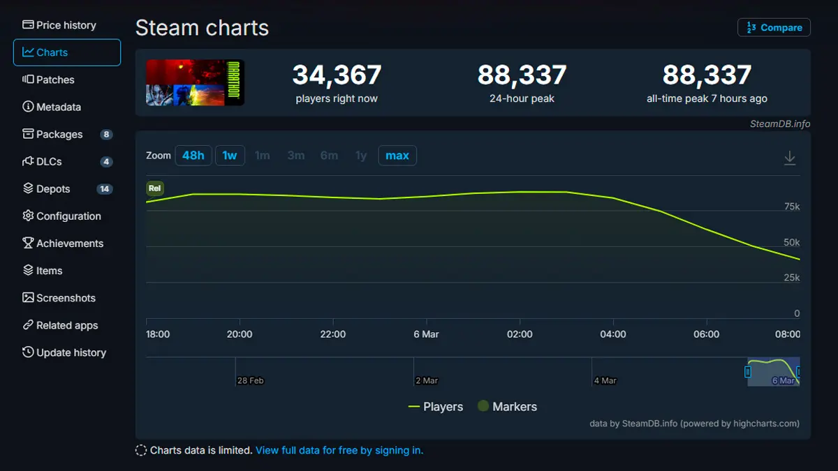 La primera herramienta a la que debemos recurrir para saber qué tal ha rendido un juego durante sus primeras horas tiene que ver con SteamDB, una base de datos que recoge la cantidad de jugadores que están jugando a un título de Steam en tiempo real. Y, si miramos su último reporte, observaremos que el pico máximo inicial de usuarios de Marathon no fue ni muy alto ni muy bajo para lo que se esperaba de él, aunque la curva ha evolucionado de forma negativa en las últimas horas.