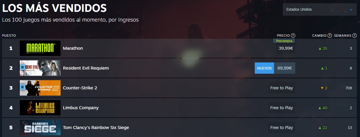 Pues en efecto, Marathon está consiguiendo vender realmente bien en Steam, algo que en PlayStation no podemos saberlo a ciencia cierta, pero creo que nos daremos cuenta conforme pasen los días. De todas formas y en caso de que no lo sepas, Steam tiene su propia web donde podemos ver los 100 videojuegos más vendidos en cada país, lo que nos da información realmente interesante sobre como va el funcionamiento (en lo que a ventas se refiere) de un videojuego. Y es que en el caso de Estados Unidos, el juego se encuentra en el TOP 1 de ventas, es decir, está superando a grandes obras como por ejemplo el reciente Resident Evil Requiem.