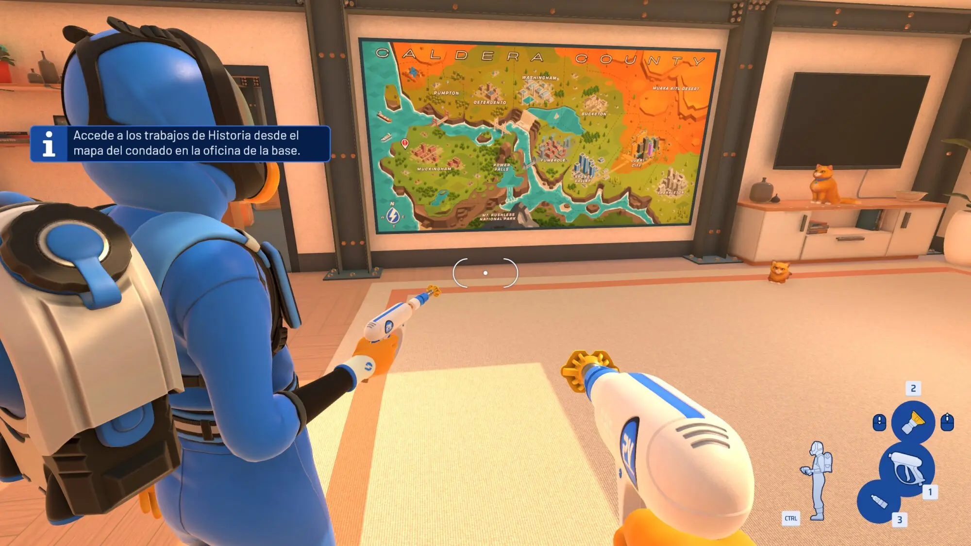 El sistema de navegación también mejora gracias a la base. En vez de menús aburridos, tienes un mapa físico en la pared donde seleccionas tu siguiente trabajo, y una estantería con maquetas de trabajos anteriores para repetirlos en modo libre. Es más intuitivo, más inmersivo, y le da personalidad al juego. Ver tu espacio llenándose de trastos limpios conforme progresas es satisfactorio de una forma que no esperaba.