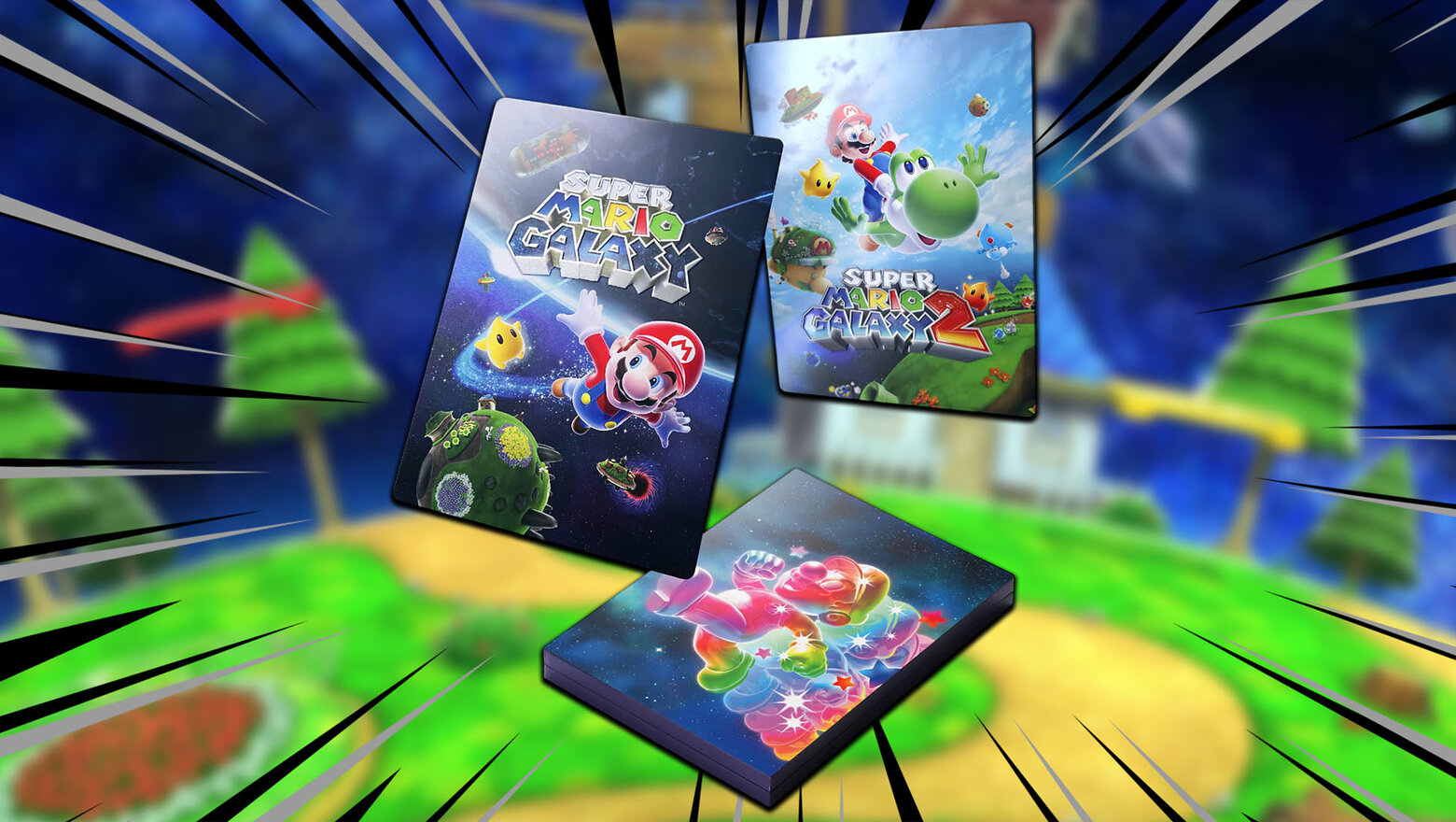 Como te estaba comentando, Nintendo ha anunciado (y ya se puede reservar) este nuevo pack que lo han bautizado como 'Pack cósmico de Super Mario Galaxy + Super Mario Galaxy 2'. Lo interesante que tiene este pack es que, aparte de obviamente traerte el videojuego físico, nos trae nada más y nada menos que un set de dos pósteres metalizados.