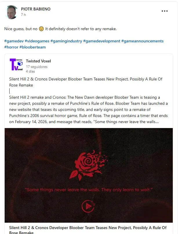 Esto ha sido confirmado a través de su cuenta de LinkedIn, donde el propio Piotr, ha dicho lo siguiente: "Buena suposición, pero no", descartando por completo las suposiciones en torno a un futuro remake del juego.