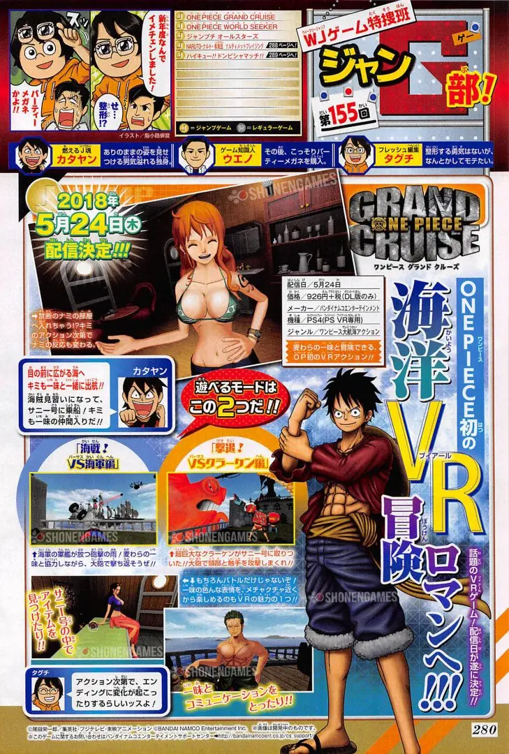 One Piece: Grand Cruise, la aventura para PlayStation VR de Bandai Namco, ya cuenta con fecha de lanzamiento en Japón. Así pues, a pesar de que por el momento en Occidente se desconoce cuándo esta obra se hará disponible, los usuarios en tierras niponas podrán disfrutar de ella a partir del 24 de mayo. Dicha información ha sido revelada mediante la última edición de la revista Weekly Shonen Jump (vía ShonenGamez):