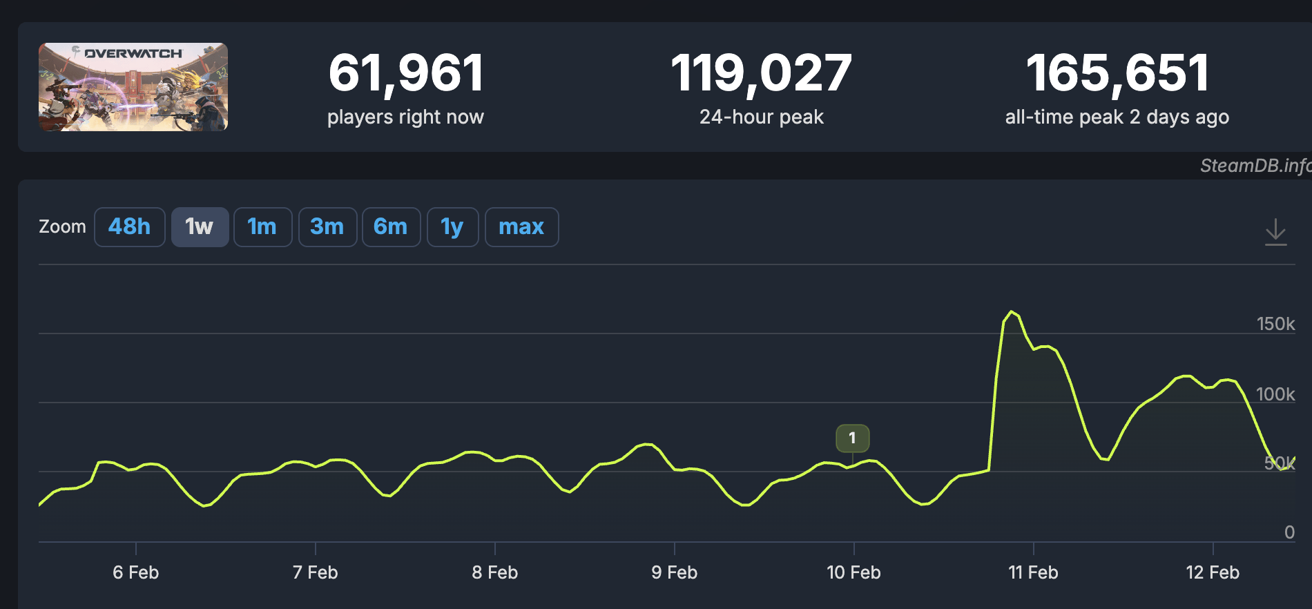 Ahí se puede ver que Overwatch apenas superaba los 50.000 jugadores simultáneos a lo largo del día, mientras que Marvel Rivals se mantiene en picos de 70.000 diarios. Sin embargo, tras la actualización, el juego de Blizzard ha cosechado más de 100.000 jugadores simultáneos de forma sobrada.