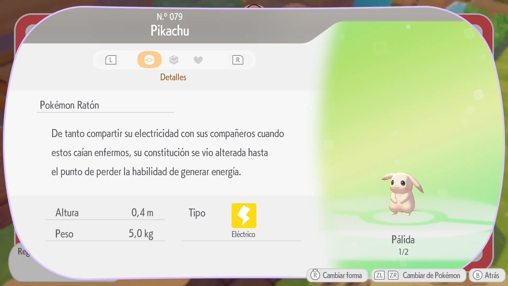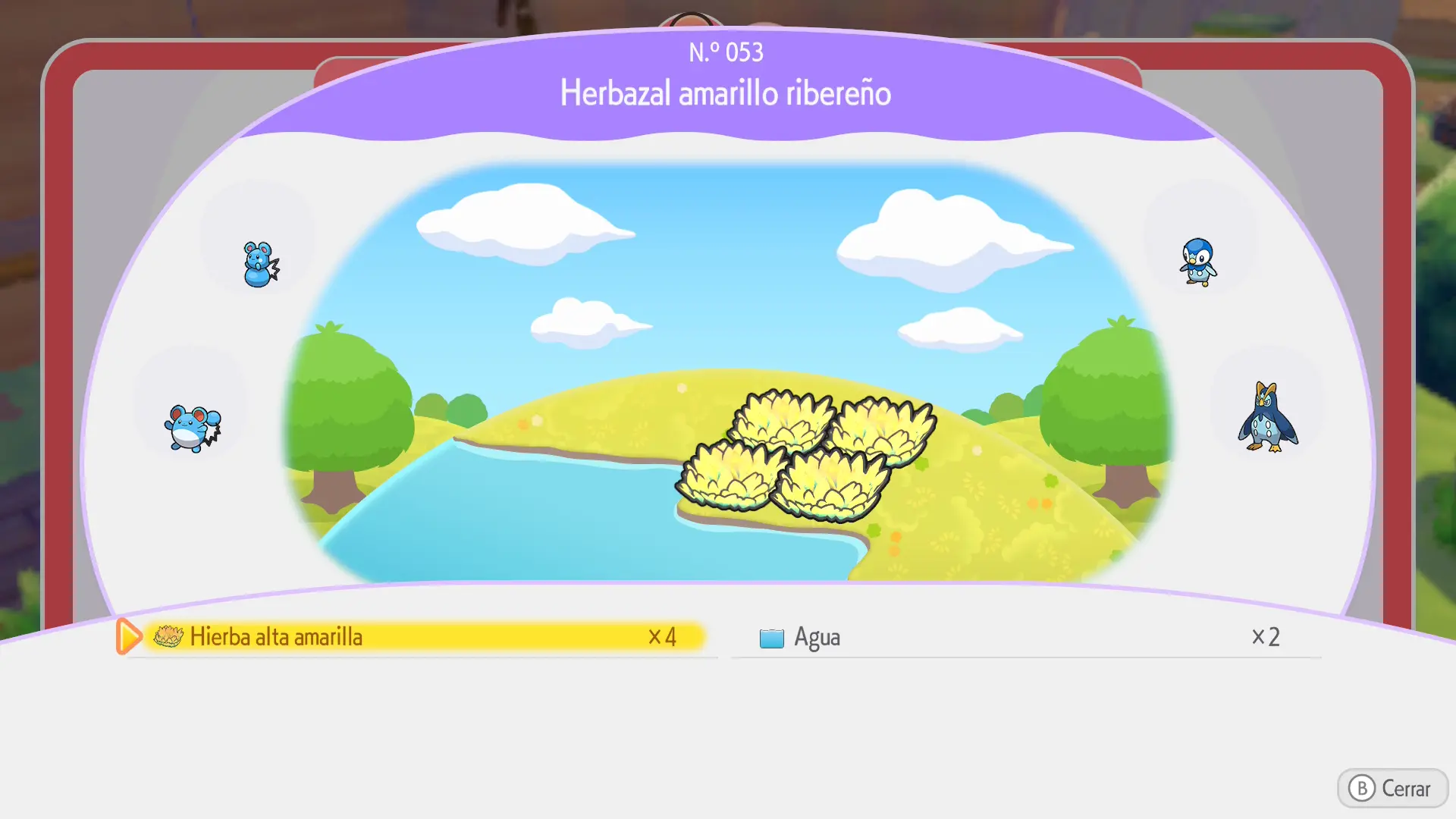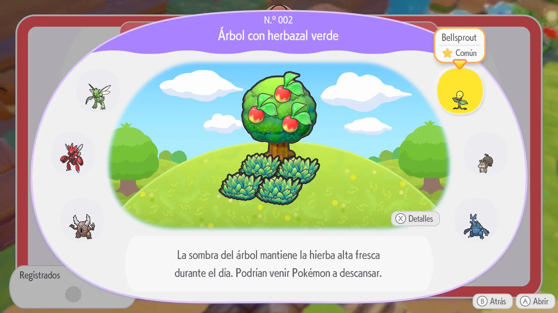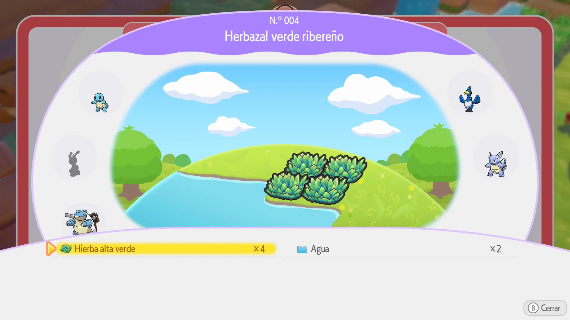 En la sección de cada Pokémon se mostrarán los siguientes datos: a qué horas aparece, en qué condiciones climáticas, su especialidad y una breve descripción de los materiales necesarios para crear su hábitat