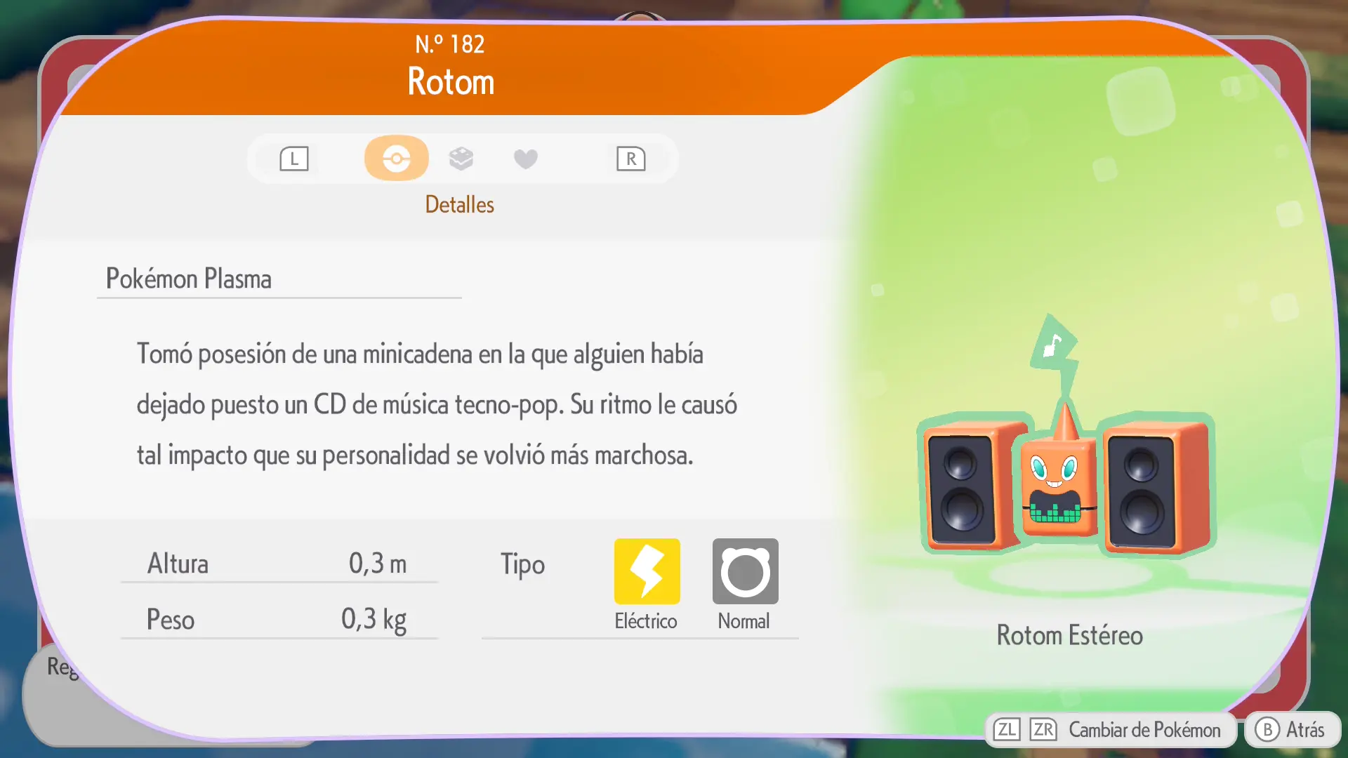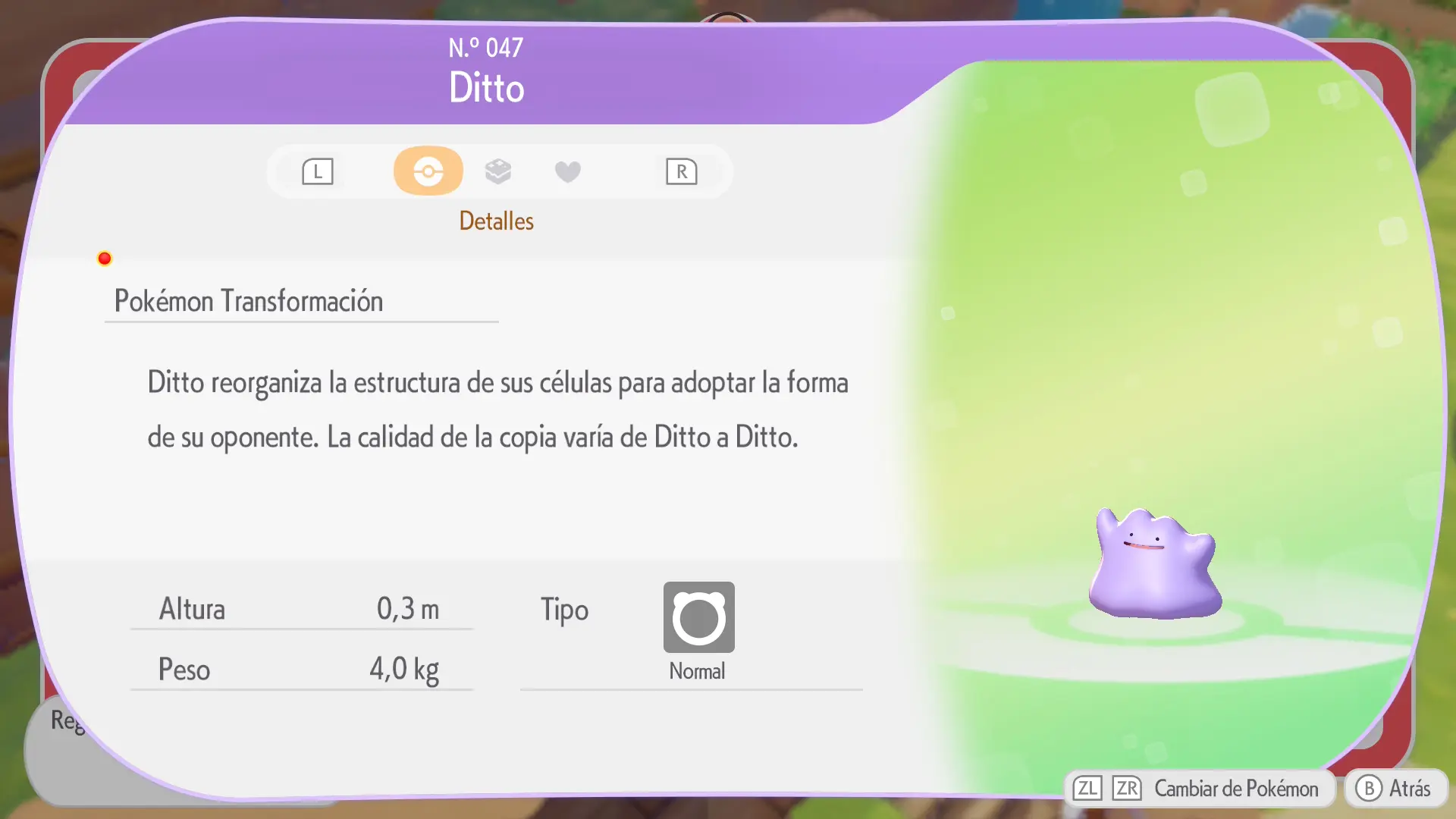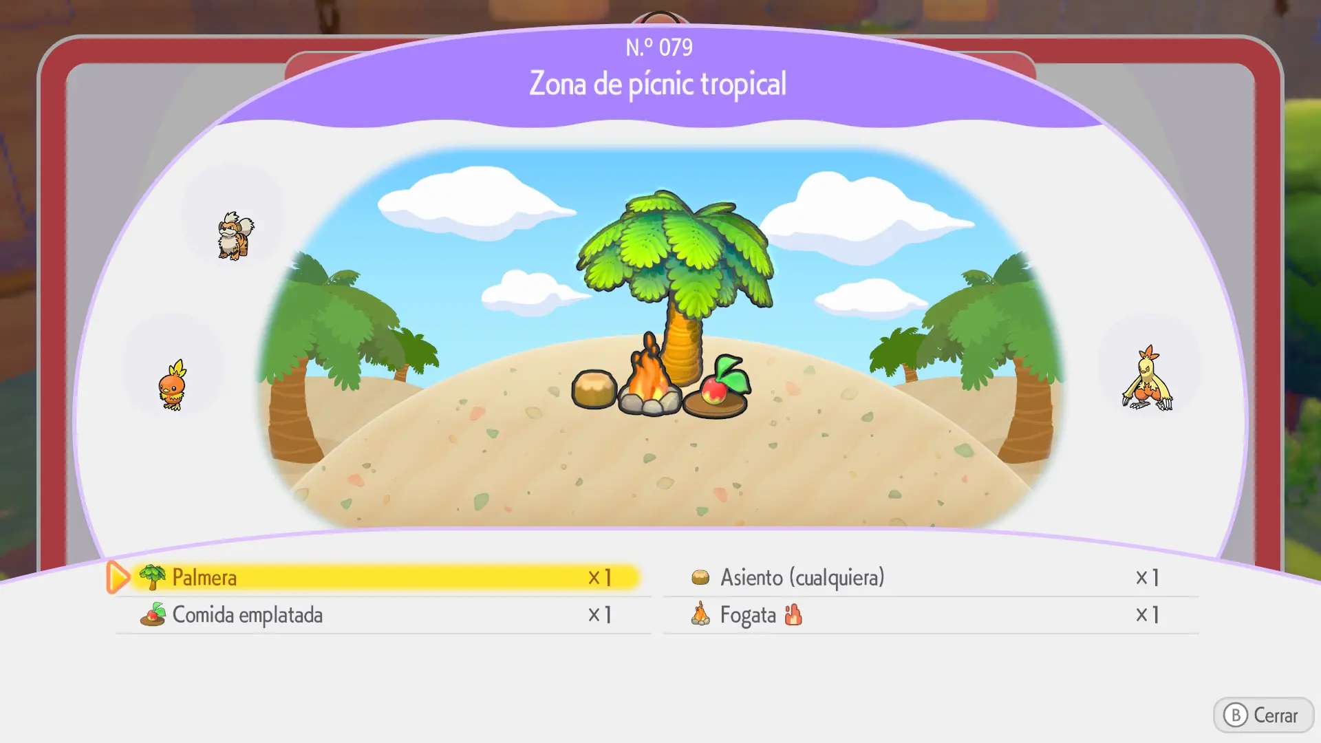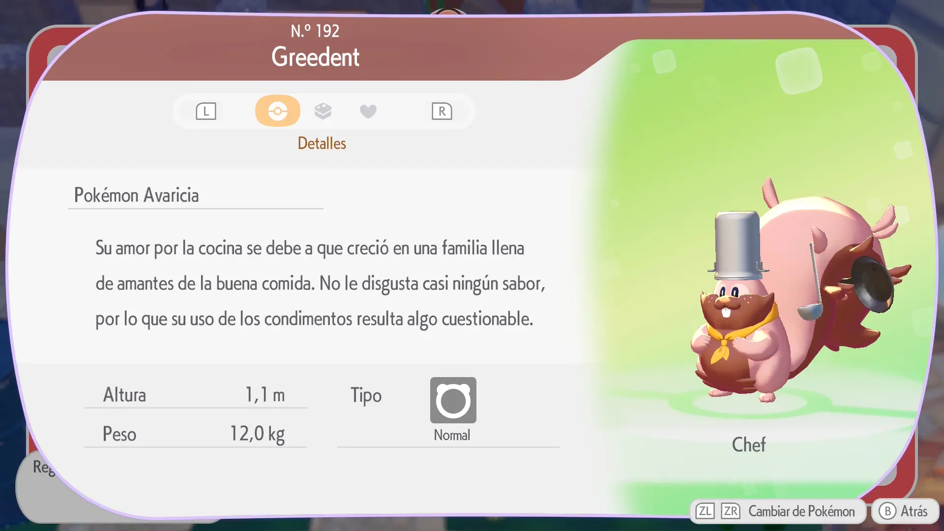 En la sección de cada Pokémon se mostrarán los siguientes datos: a qué horas aparece, en qué condiciones climáticas, su especialidad y una breve descripción de los materiales necesarios para crear su hábitat