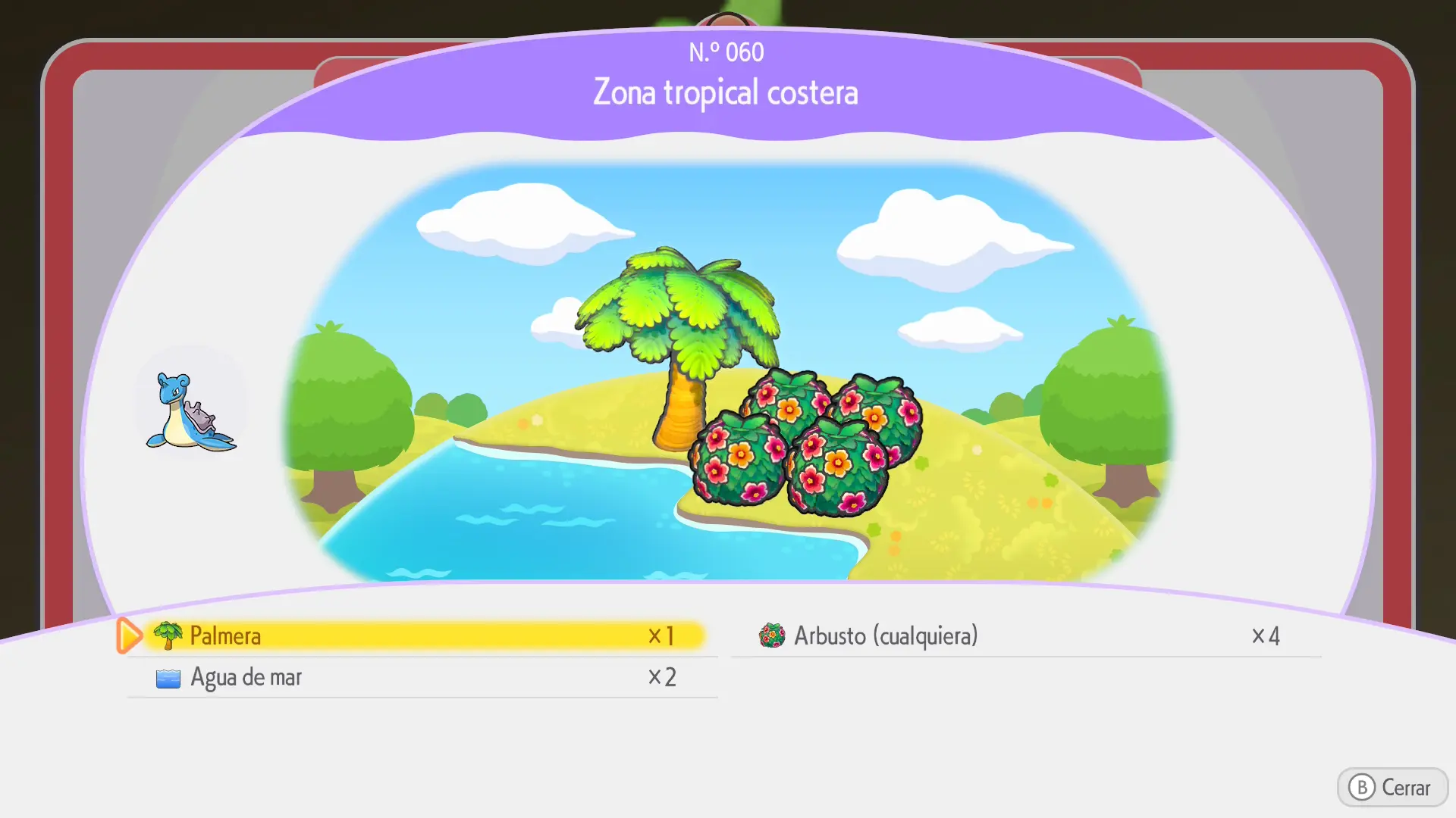 Se crea juntando 4 flores costeras entre sí (se encuentran en el bioma de Bahía Borrasca. Podrás arrancar las que veas por ahí con la habilidad de Arar para colocarlas donde quieras. También podrás plantarlas desde cero comprando sus semillas en el Centro Pokémon u obteniéndolas al recoger Pokéballs rojas y completando peticiones para los Pokémon)