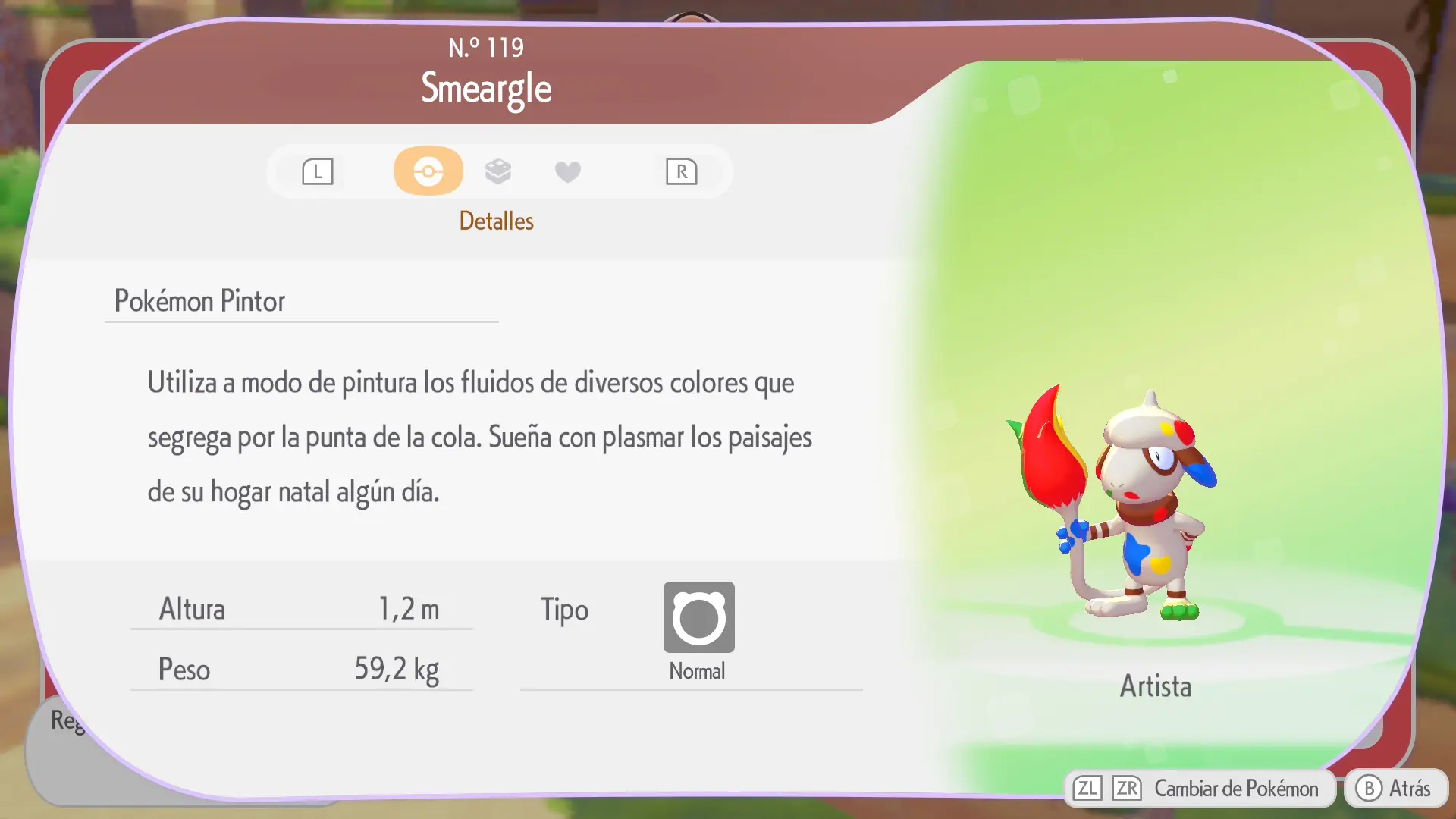 Smeargle es otro de esos Pokémon que podrás encontrar campando a sus anchas por una de las zonas del juego. Concretamente, podrás verlo pintando cerca de la cueva del Snorlax en Bahía Borrasca y, una vez hables con él, quedará registrado en la Pokédex.