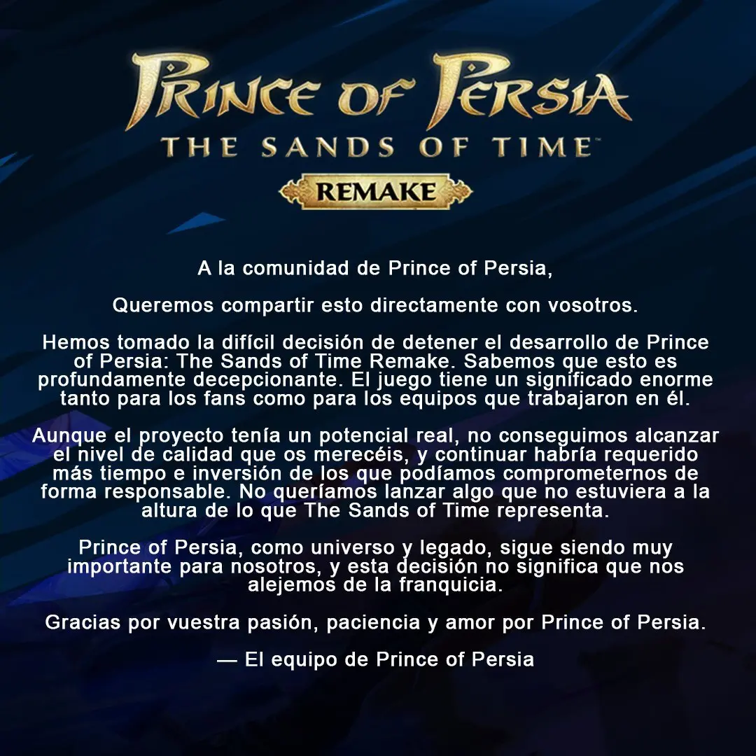En 2023, Ubisoft Montreal, el estudio que hizo el Prince of Persia: The Sands of Time original de 2003, tomó las riendas del desarrollo. El juego recibió una ventana de lanzamiento para 2026, y en 2024 Ubisoft Toronto se unió para colaborar. Hasta ayer se esperaba que saliera antes de marzo de 2026 y hasta tenía el ESBR. Ahora todo ese trabajo va a la basura después de casi seis años de desarrollo y cambios constantes entre estudios.