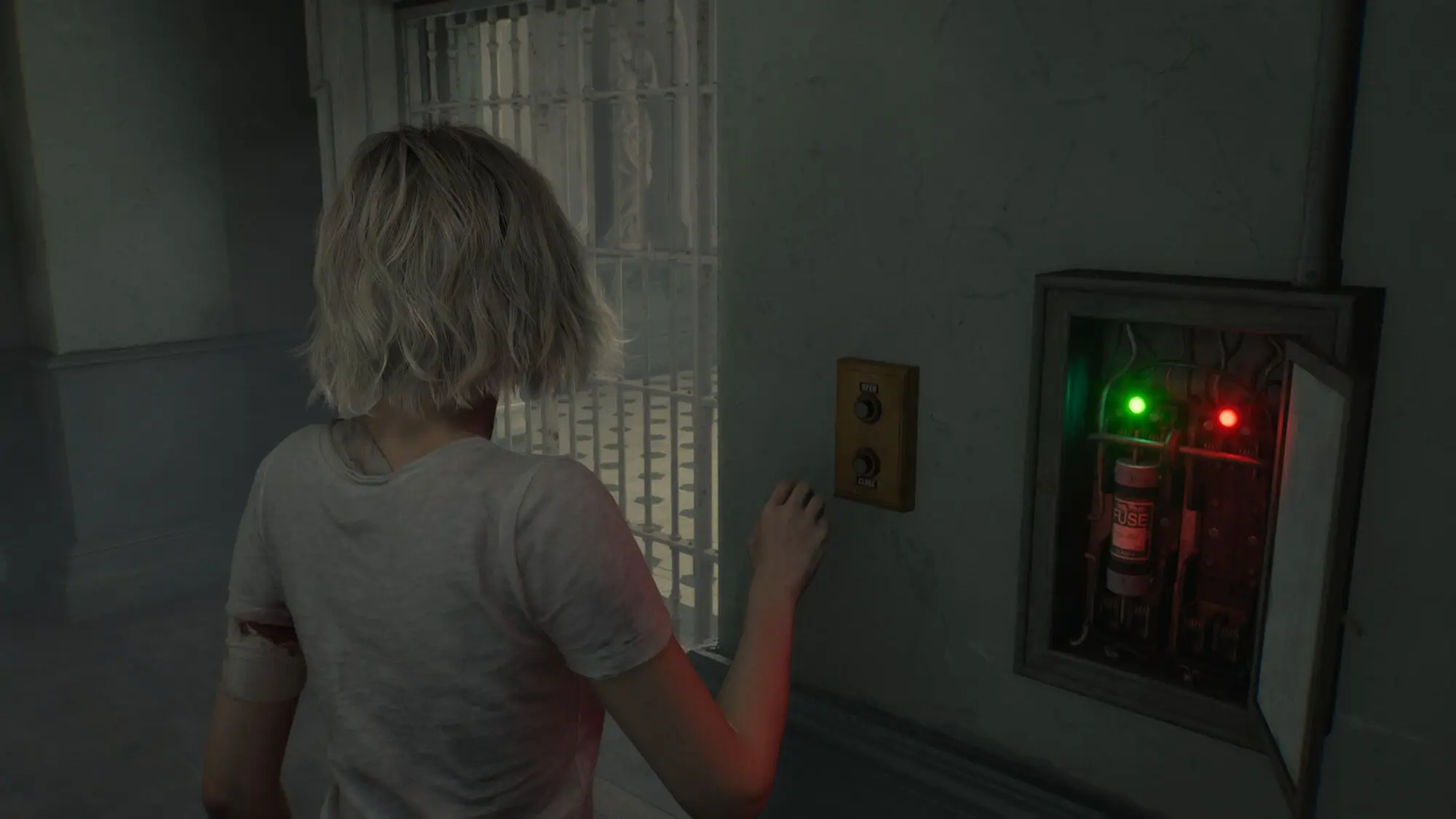 Primero, al explorar encuentras la caja eléctrica en un pasillo cerca de una ventana enrejada: dos luces, una verde y una roja, y un One-Time Fuse Class H instalado dentro. El problema es que no puedes sacarlo directamente con lo que tienes encima.