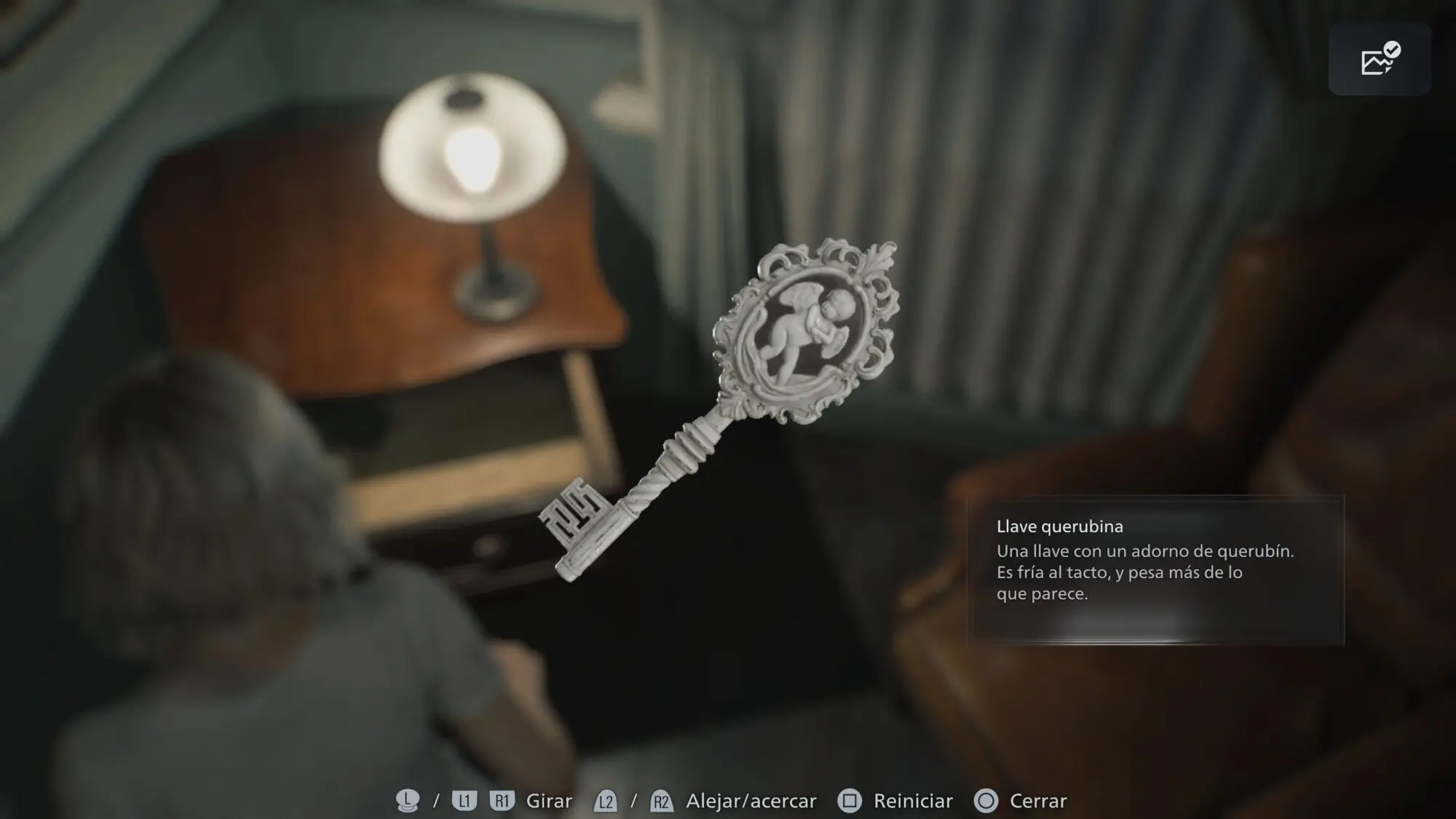 Tercero, en el pasillo con objetivo activo "Consigue el fusible", en una pequeña sala con una lámpara encendida y un sillón de cuero, hay una mesita con cajón. Dentro: la Llave del querubin. La descripción dice todo lo que necesitas saber: "Una llave con un adorno de querubín. Es fría al tacto, y pesa más de lo que parece." Con ella en el inventario, vuelve a la Habitación 204 y abre la cerradura con el adorao que coincide exactamente con el grabado de la llave.