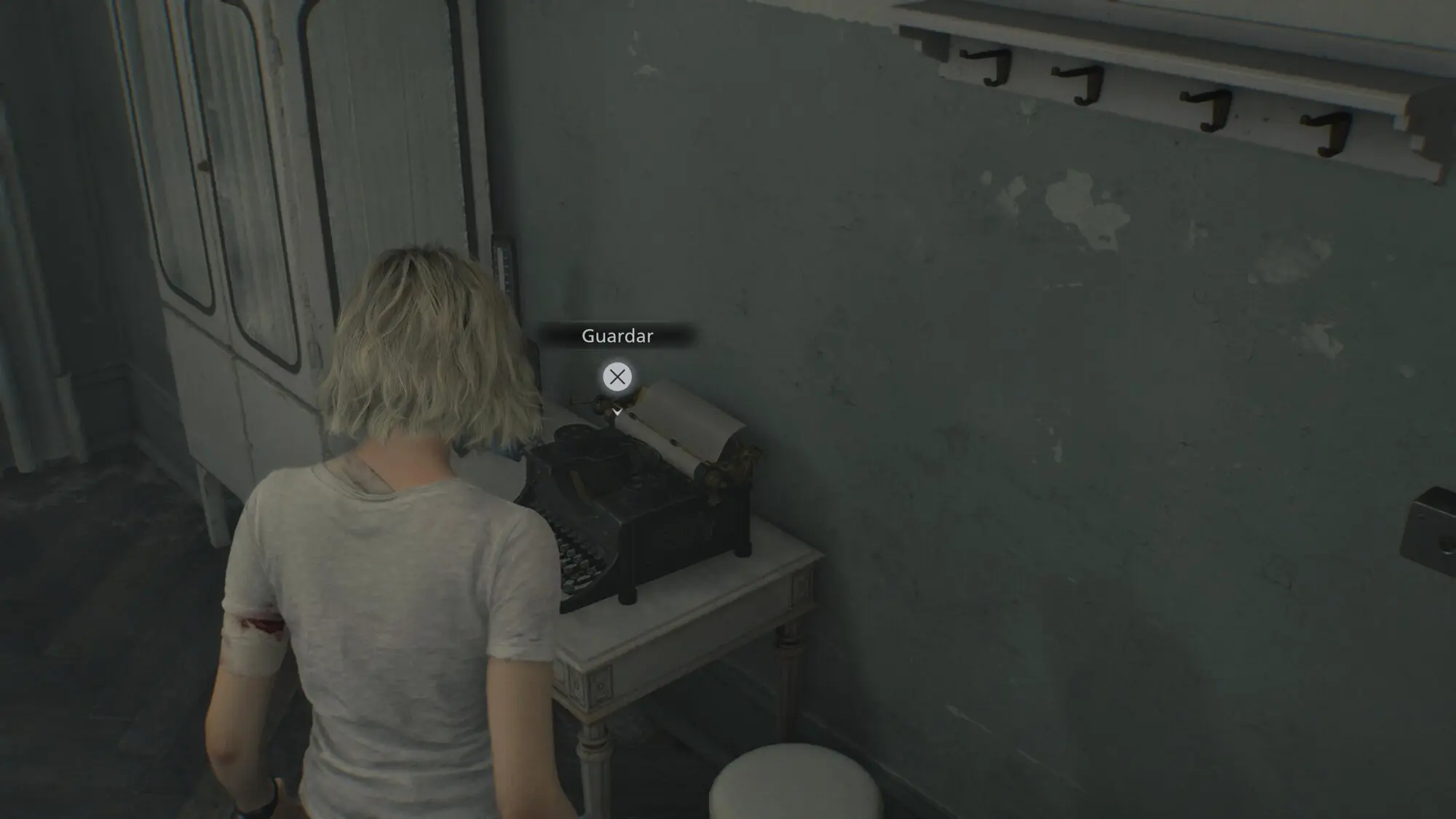 En una de las habitaciones del ala izquierda hay una máquina de escribir clásica de Resident Evil. Guarda la partida aquí antes de continuar. El tramo del fusible implica algo de exploración con la criatura activa y no querrás repetir nada si las cosas se complican.