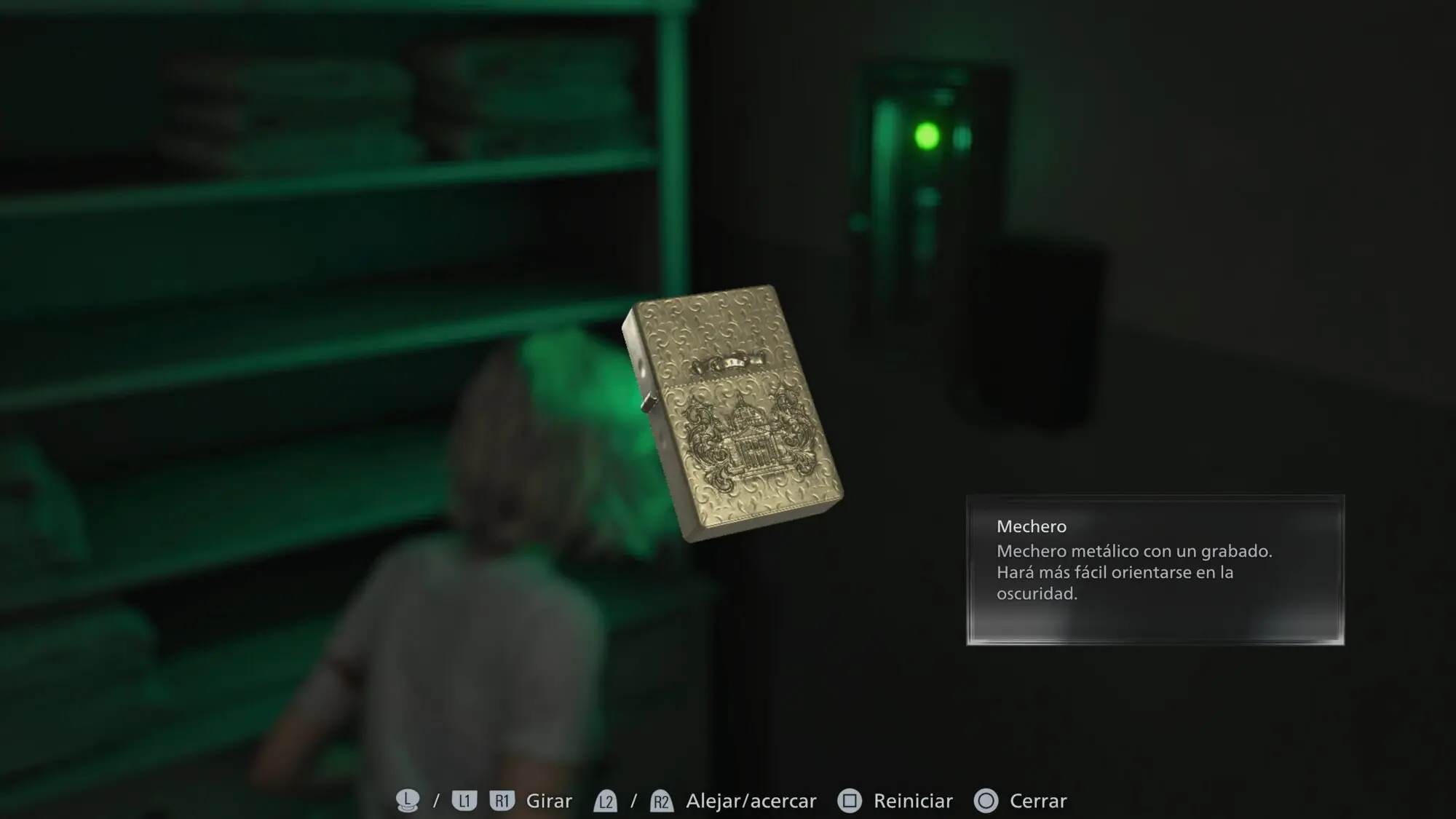En la misma habitación donde está la caja eléctrica verde, en una estantería, hay un mechero metálico con un grabado elaborado. La descripción lo confirma: "Hará más fácil orientarse en la oscuridad." Y en este centro hay zonas donde la oscuridad es total. Recógelo siempre.