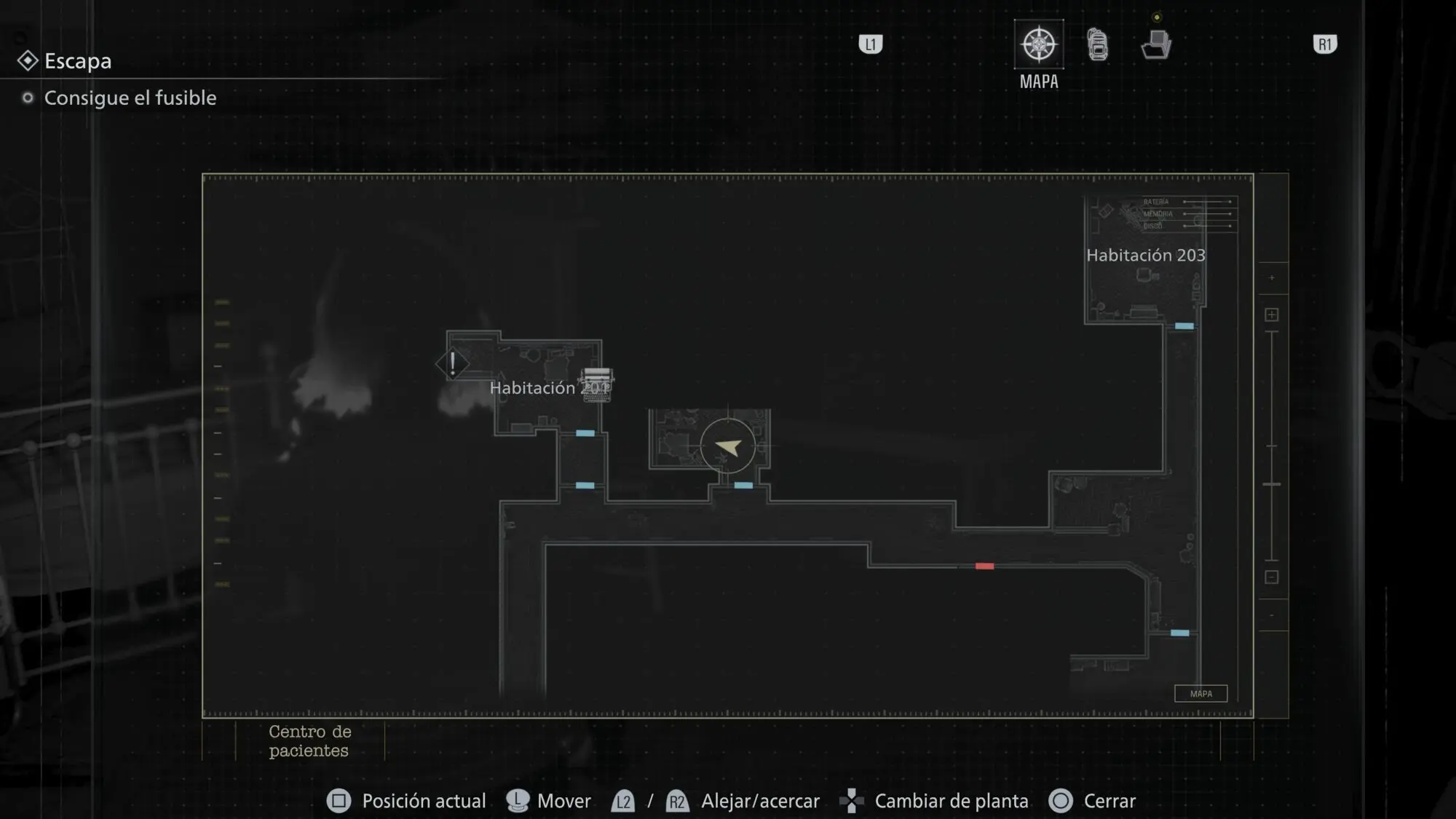 Lo mejor que puedes hacer nada más tomar el control es abrir el mapa. El Centro de Pacientes está bien estructurado en dos plantas navegables. En la primera tienes los pasillos principales con varias habitaciones numeradas, incluyendo las Habitaciones 203 y 204, y en el ala central hay una sala circular que hace de nexo. El mapa te muestra dos tipos de marcadores: los azules son puertas cerradas o puntos de interés, el rojo es un enemigo activo. Úsalo con frecuencia porque la iluminación del centro es terrible.