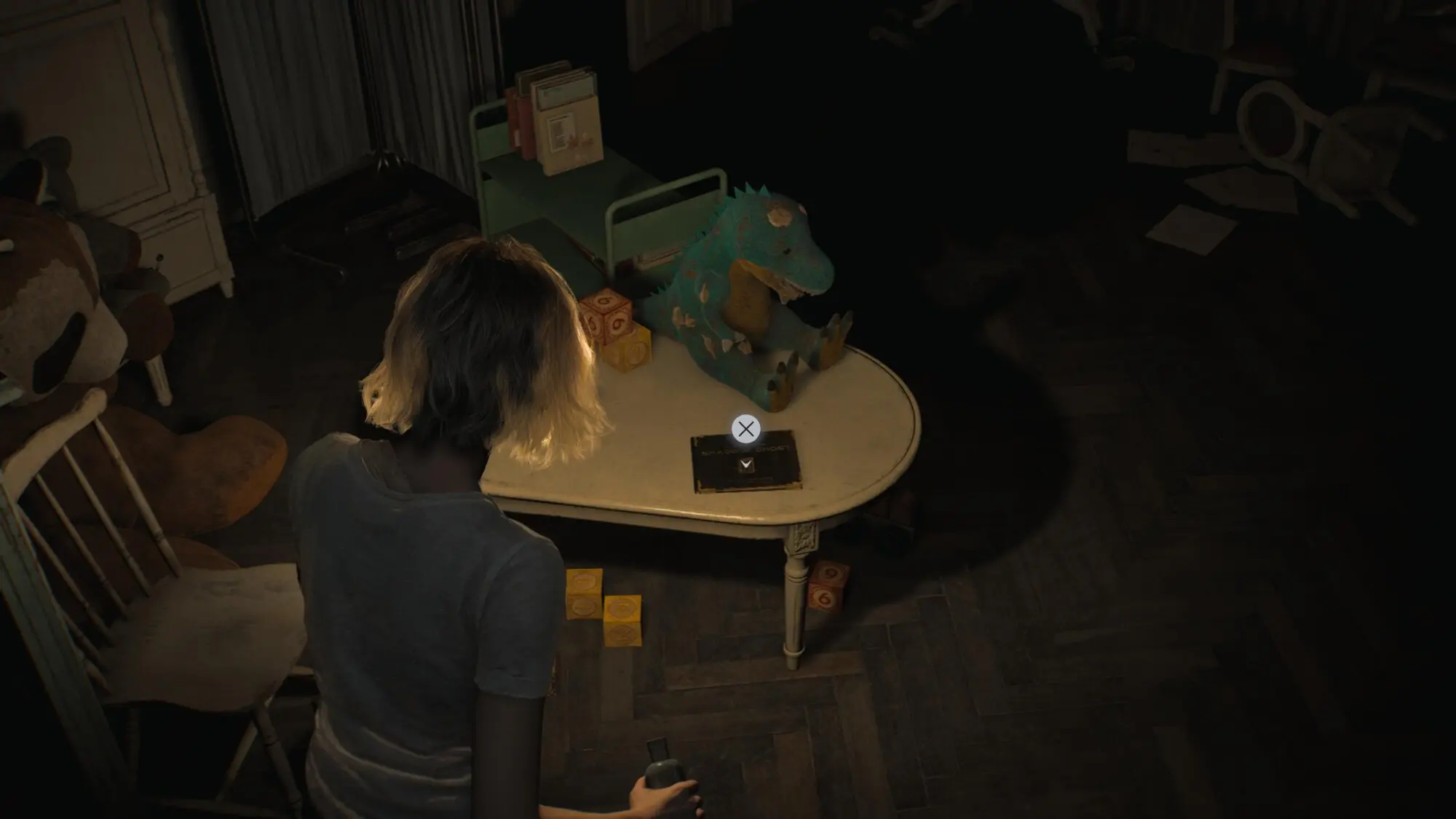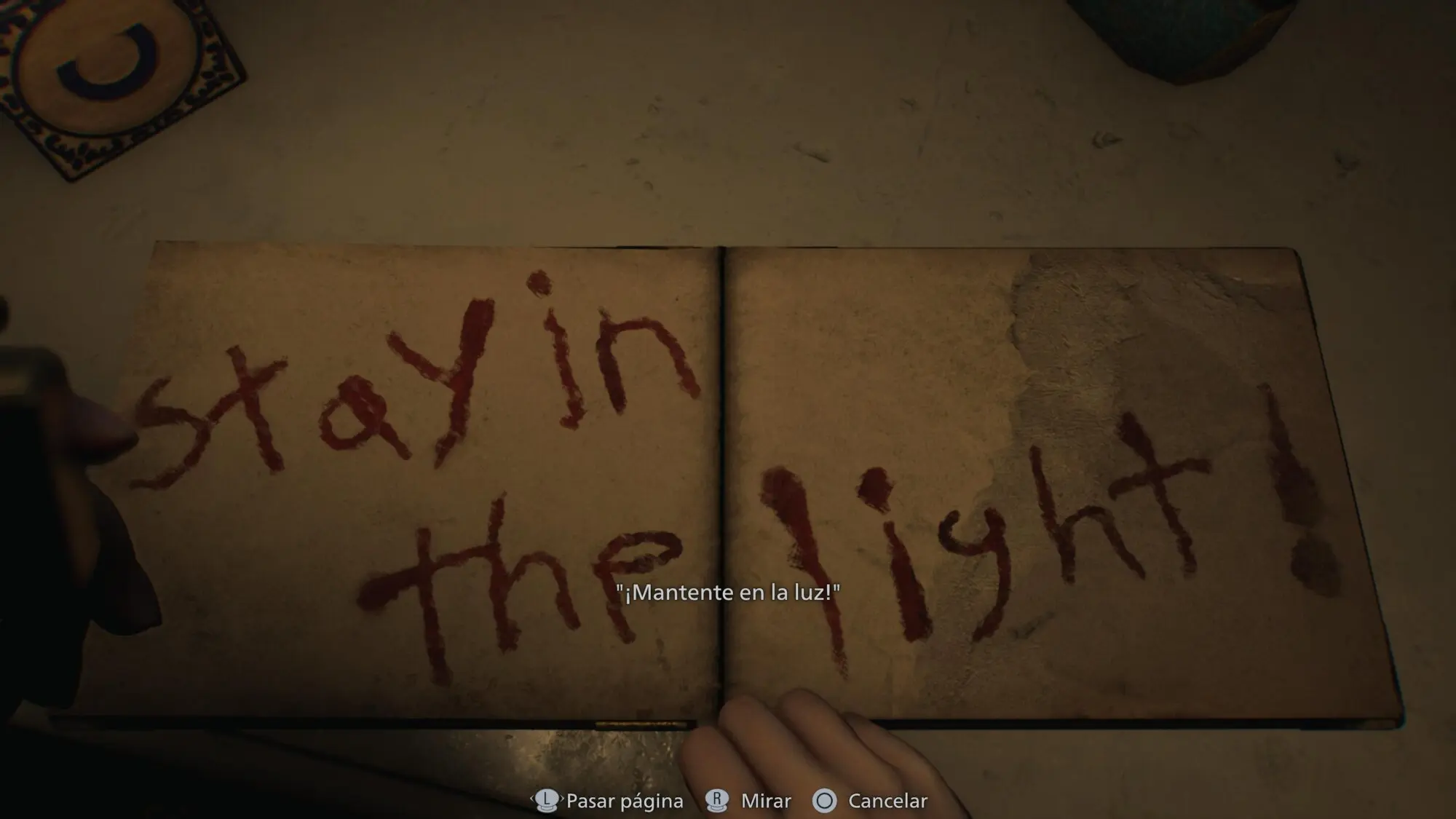 Dos piezas de lore importantes en este tramo. La primera es un libro de notas en la sala infantil con un dinosaurio de juguete sobre la mesa. Al abrirlo: páginas vacías y luego, escrito con algo rojo en letras grandes que ocupan toda la doble página, la advertencia más inquietante del juego hasta este punto: "Stay in the light!""¡Mantente en la luz!" Escrito por alguien que claramente sabía algo sobre las criaturas del centro.