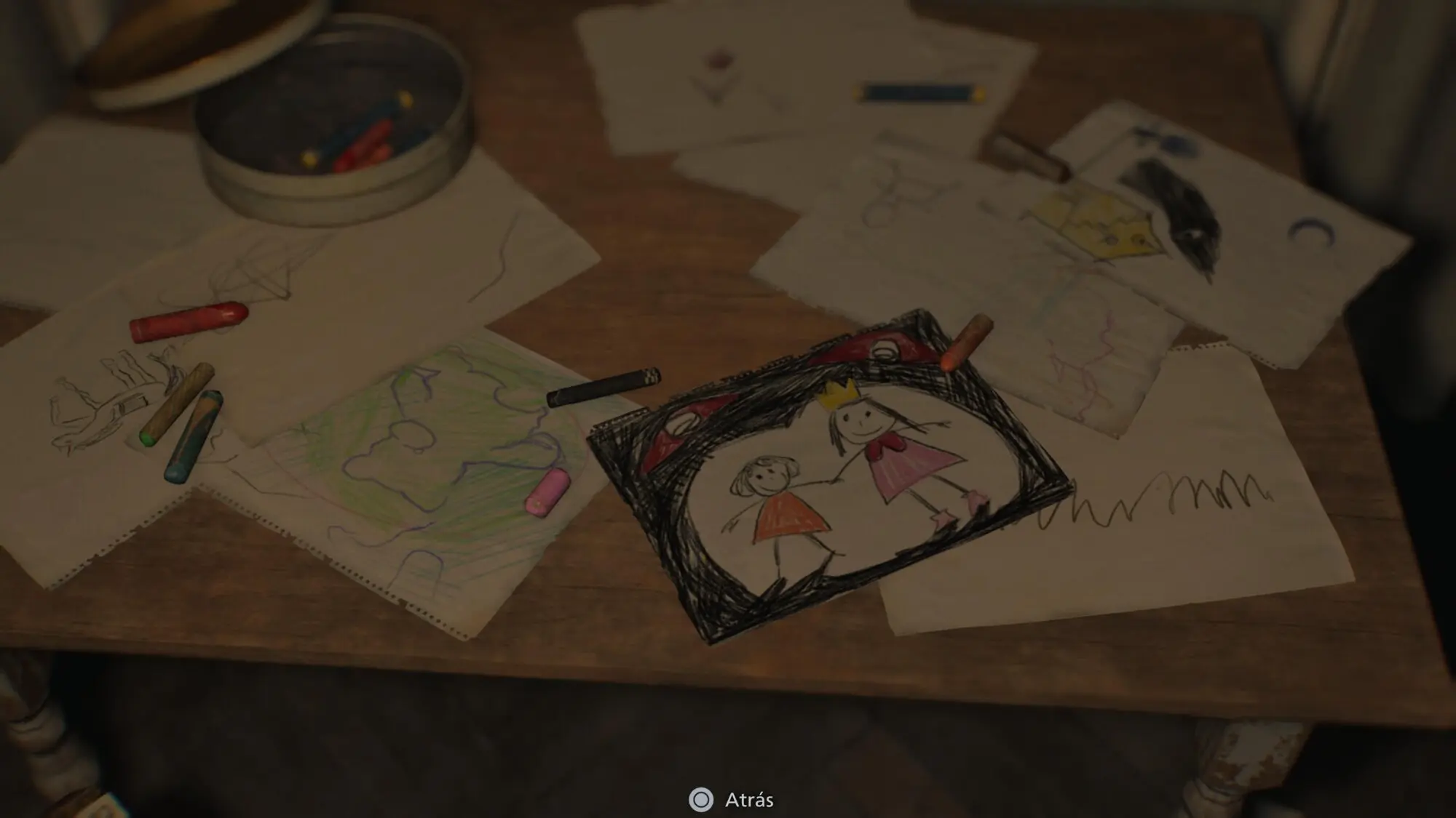 En la misma habitación hay dibujos de niño sobre una mesa con ceras: el central muestra a dos figuras femeninas, una con corona, rodeadas de negro. No es decoración inocente.