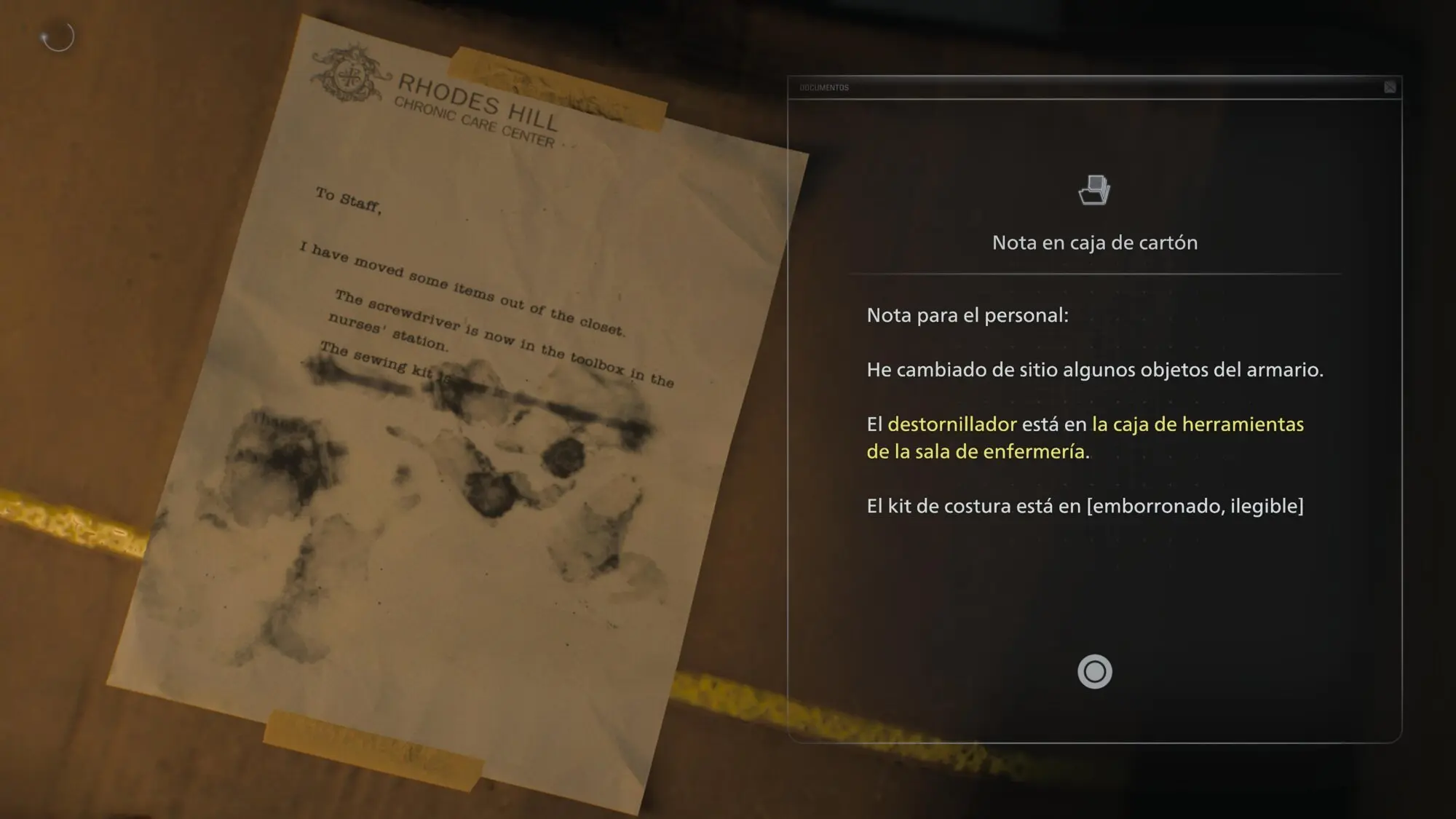 La segunda pieza es la Nota en caja de cartón con membrete del Rhodes Hill Chronic Care Center. Firmada para el personal, dice que han movido objetos del armario: el destornillador ahora está en la caja de herramientas de la sala de enfermería, y el kit de costura está en un lugar cuya segunda línea está emborronada e ilegible. Dos pistas para más adelante, una completa y una incompleta.