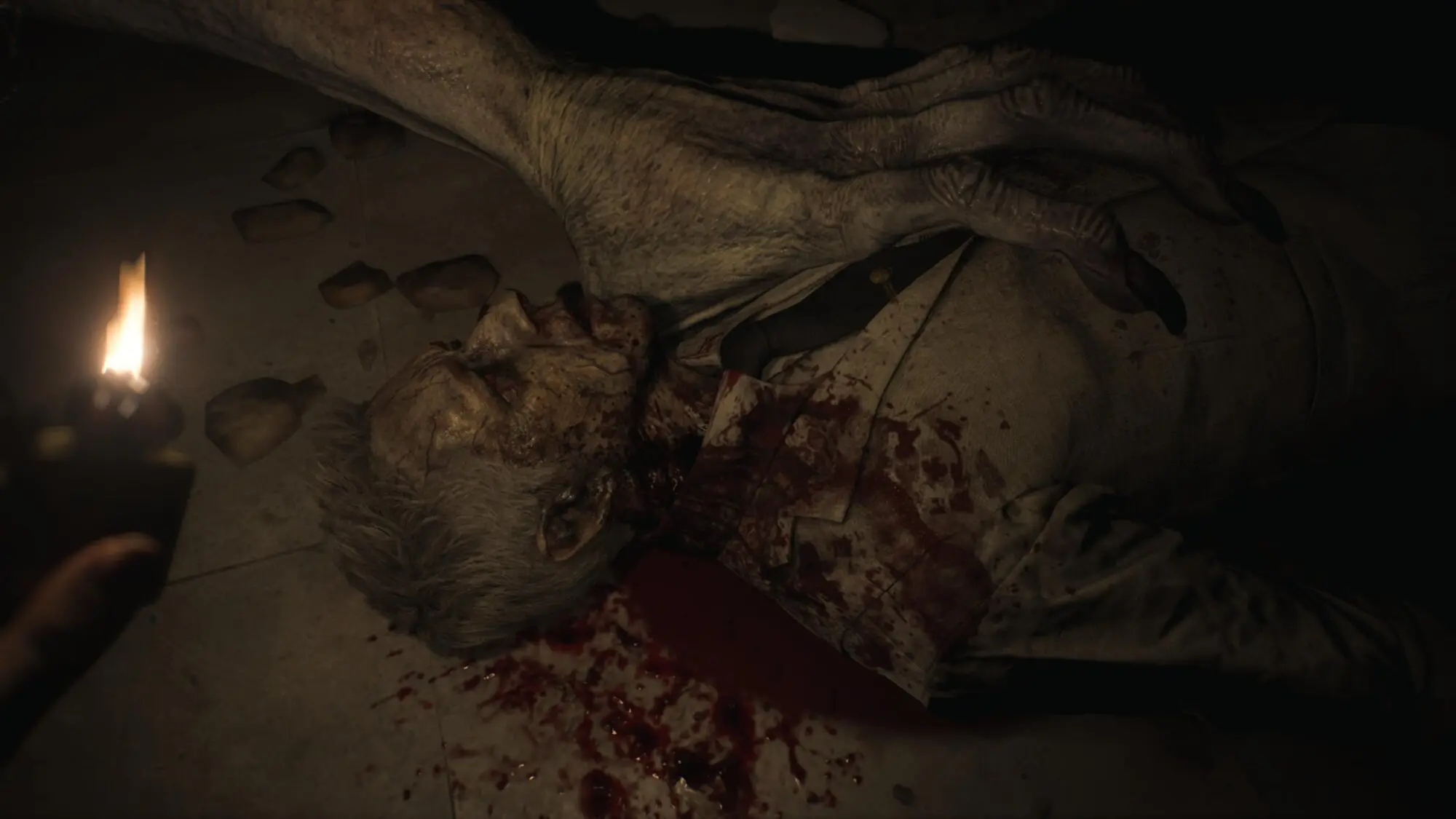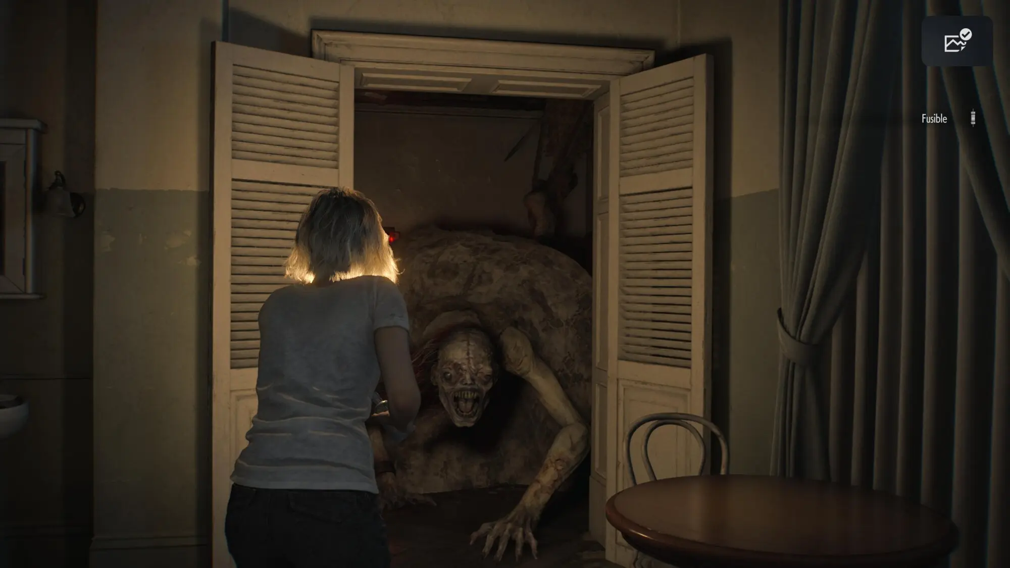 Cuando llevas el fusible de vuelta hacia la zona de salida y abres la puerta de doble hoja que bloquea el camino, lo que sale de dentro no es lo que esperabas. Una criatura masiva, con el cuerpo completamente deformado y la piel convertida en una masa de tejido corrompido, sale arrastrándose por el umbral con la cabeza girada hacia Grace. Es la criatura más grande que has visto hasta ahora en el juego y sale de un espacio que físicamente no debería poder contenerla.