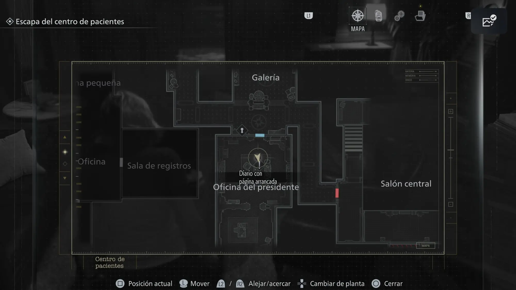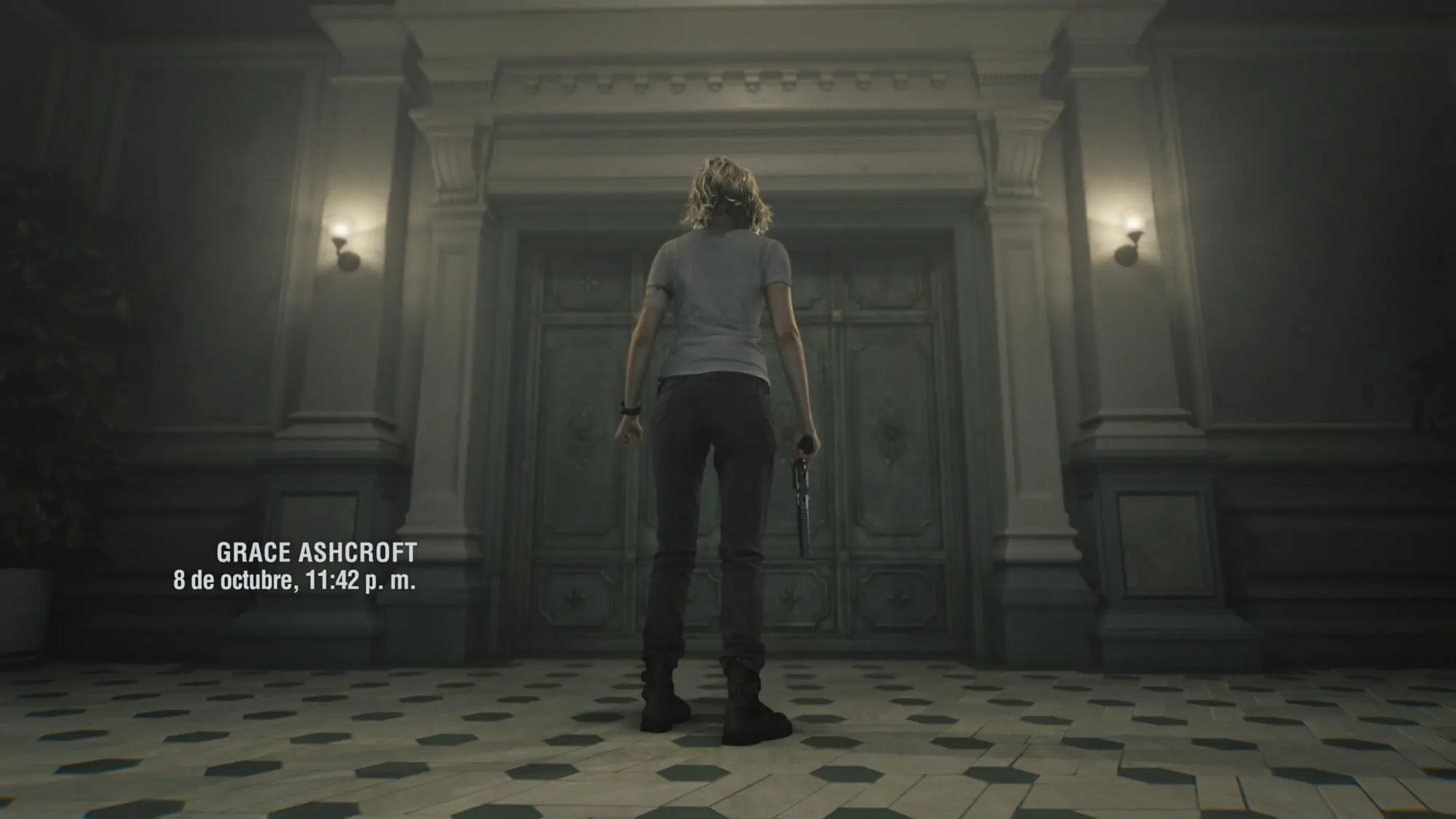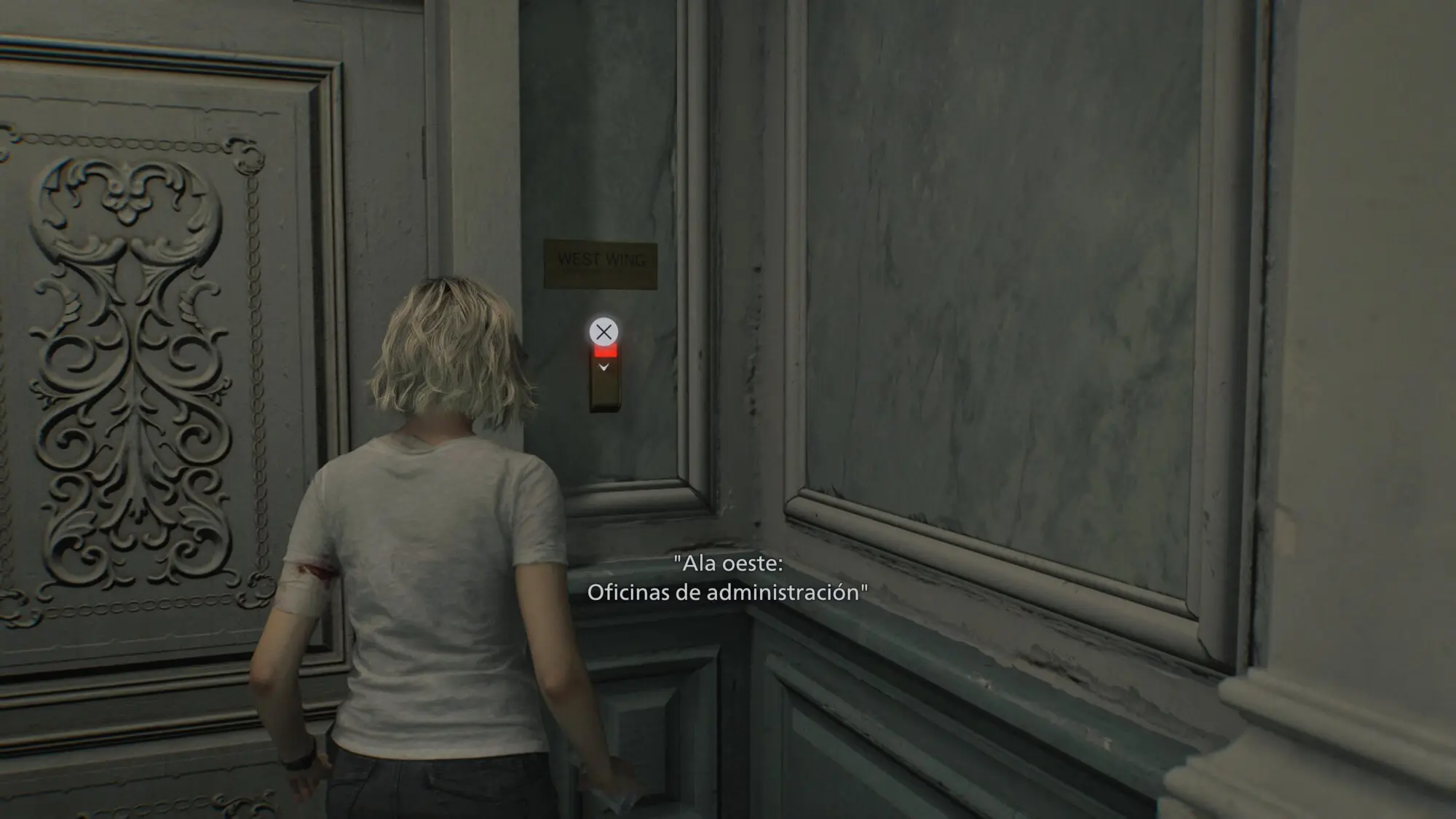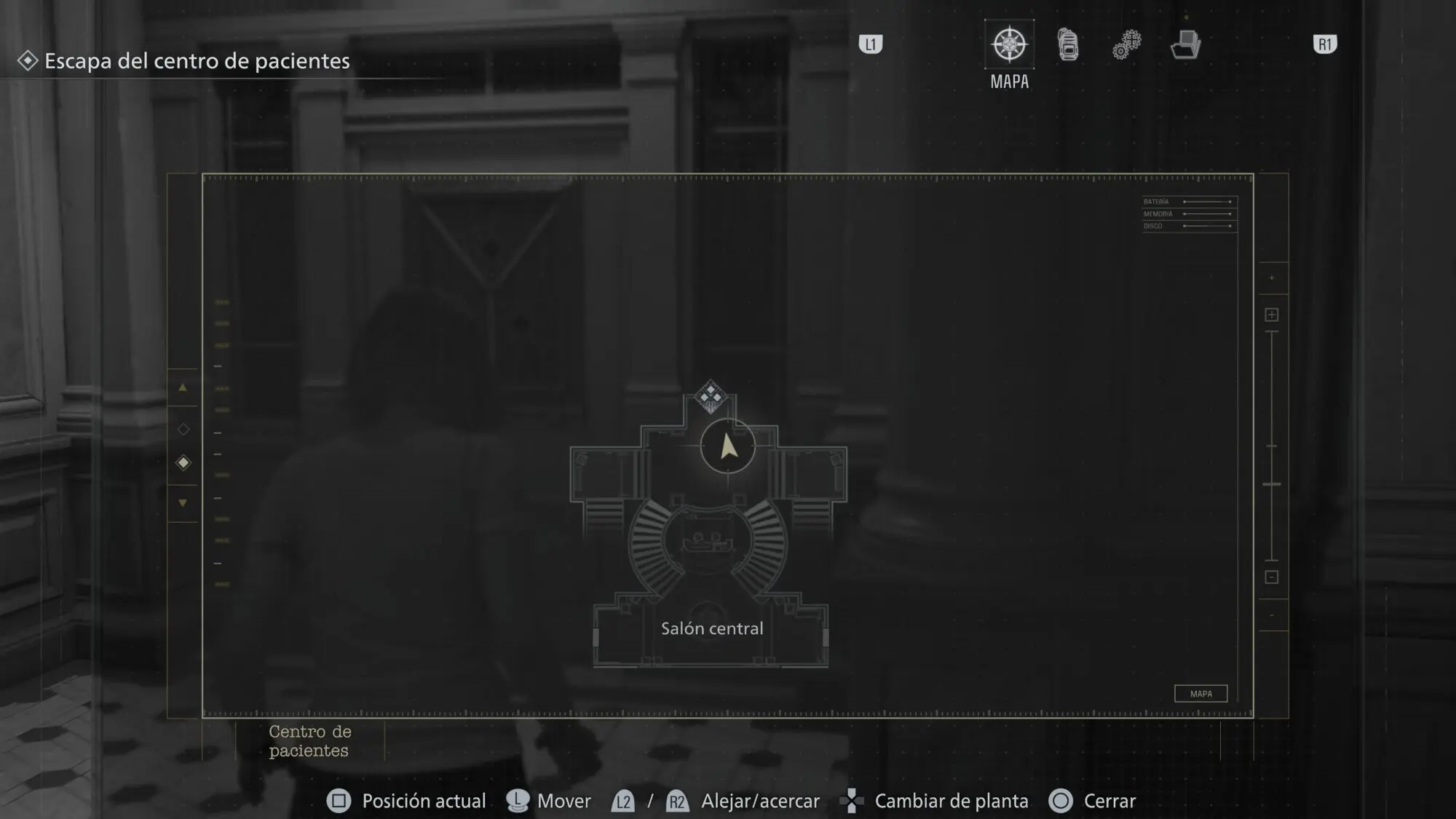 El mapa cambia radicalmente. Donde Leon operaba en la Unidad de rehabilitación con pasillos amplios y marcadores de enemigos, ahora Grace está de pie en el Salón central — la gran sala neoclásica con cúpula, columnas y araña colgante que desde la perspectiva de Leon era solo el hall de entrada. Desde la planta superior, con la pistola en la mano y las heridas todavía visibles, el edificio se ve completamente diferente. Más grande. Más abierto. Y el objetivo ya no es investigar: es salir.