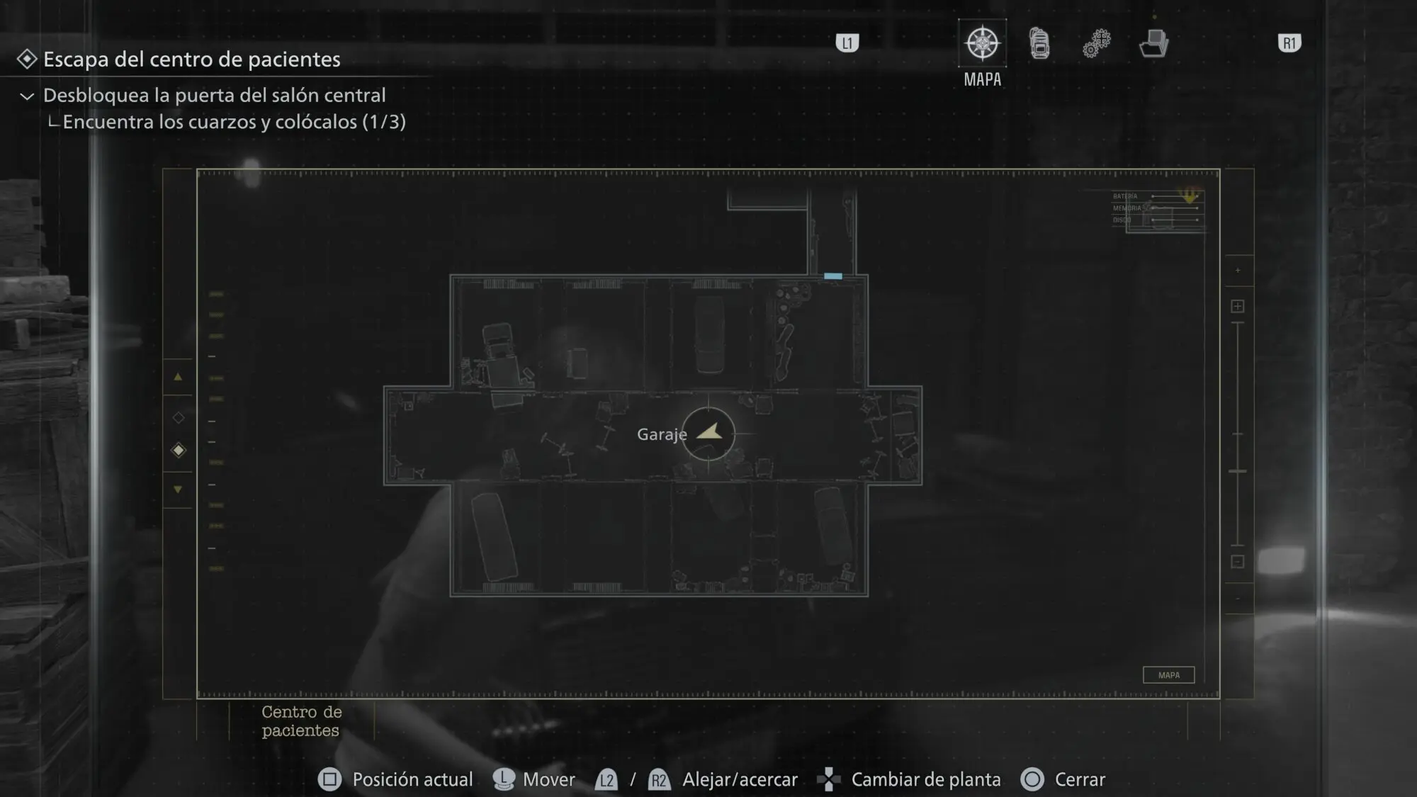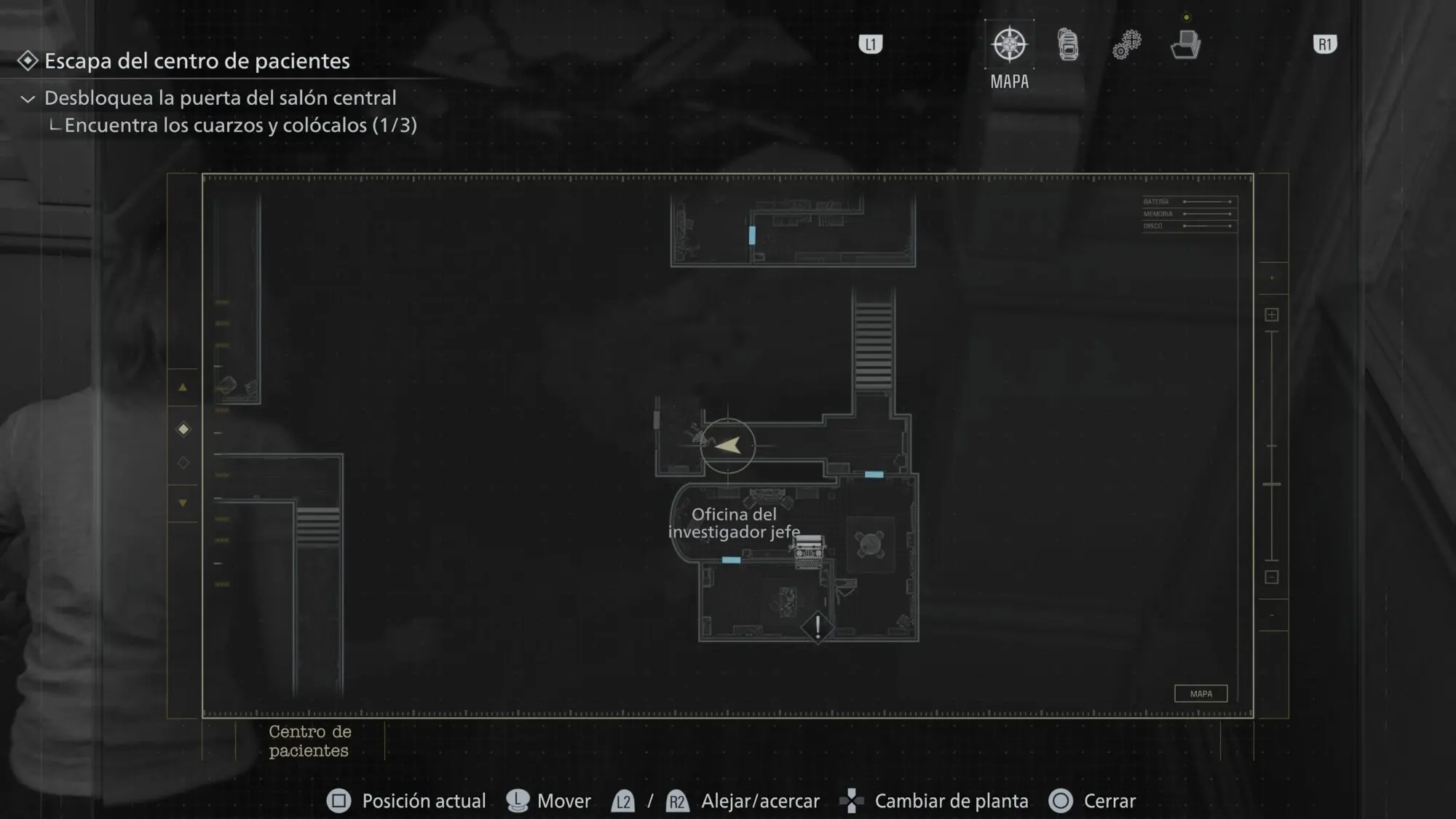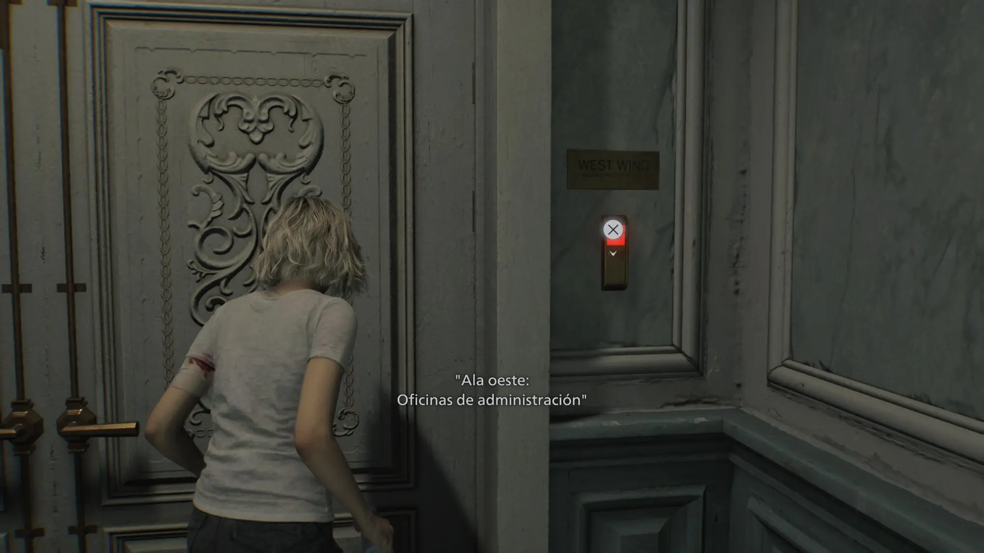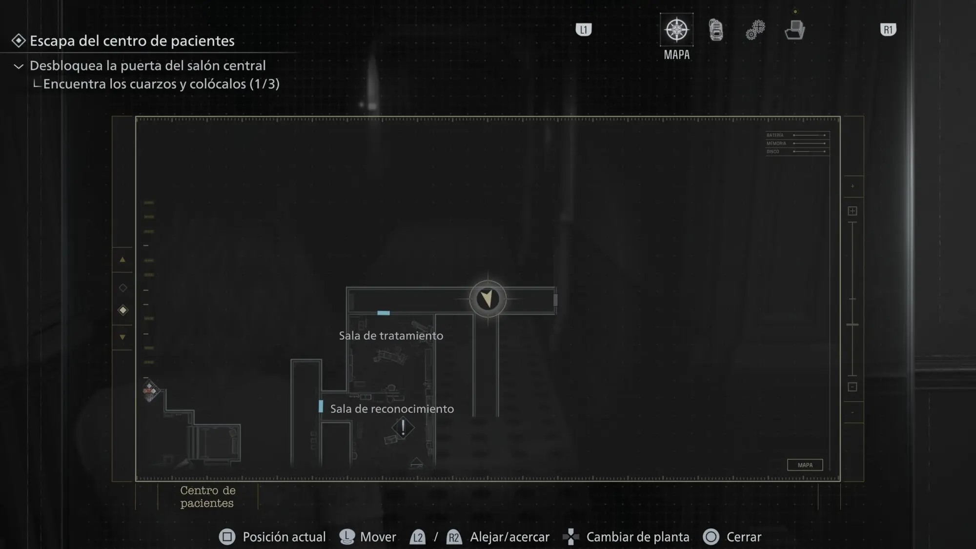 El mapa cambia radicalmente. Donde Leon operaba en la Unidad de rehabilitación con pasillos amplios y marcadores de enemigos, ahora Grace está de pie en el Salón central — la gran sala neoclásica con cúpula, columnas y araña colgante que desde la perspectiva de Leon era solo el hall de entrada. Desde la planta superior, con la pistola en la mano y las heridas todavía visibles, el edificio se ve completamente diferente. Más grande. Más abierto. Y el objetivo ya no es investigar: es salir.