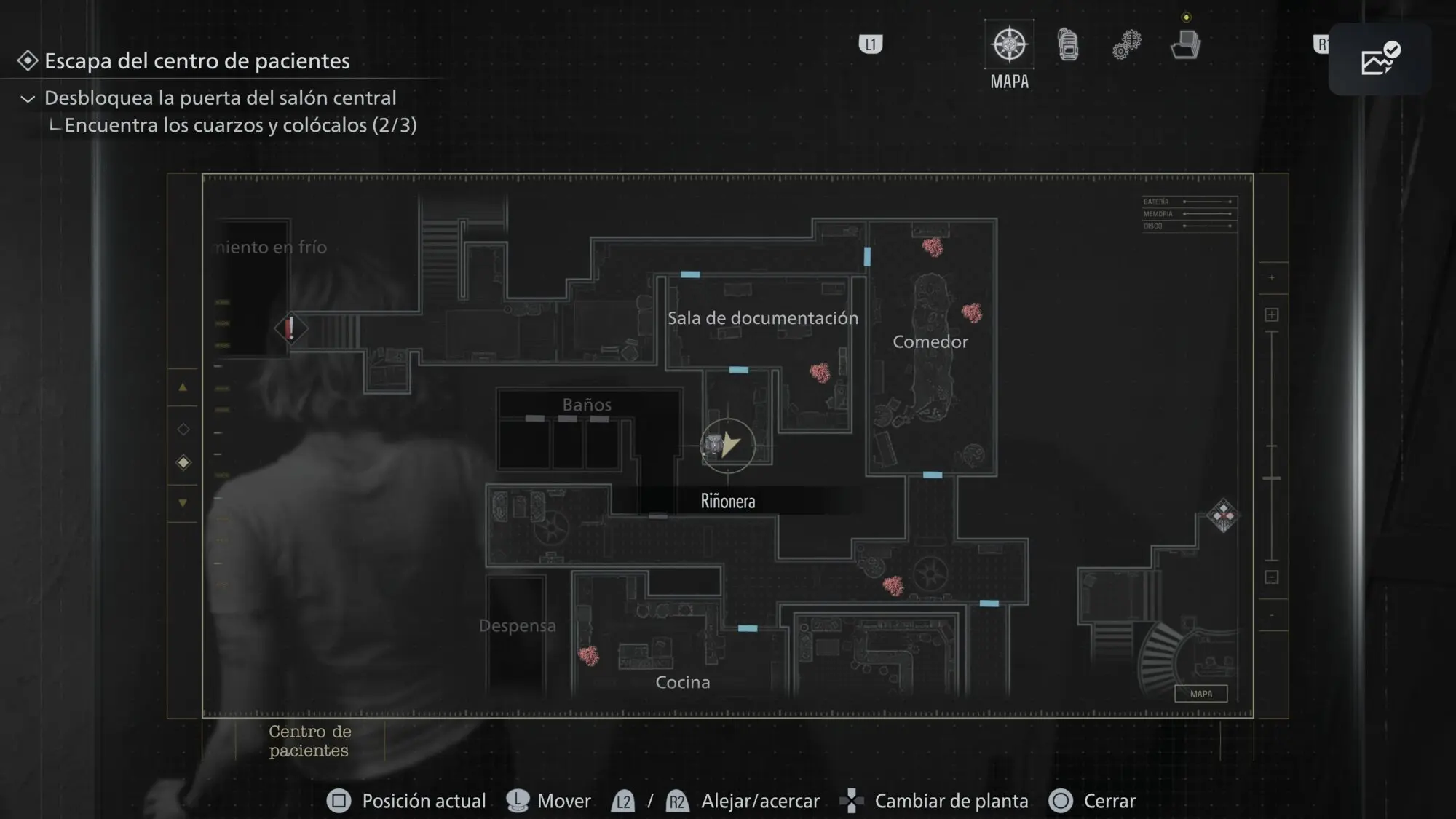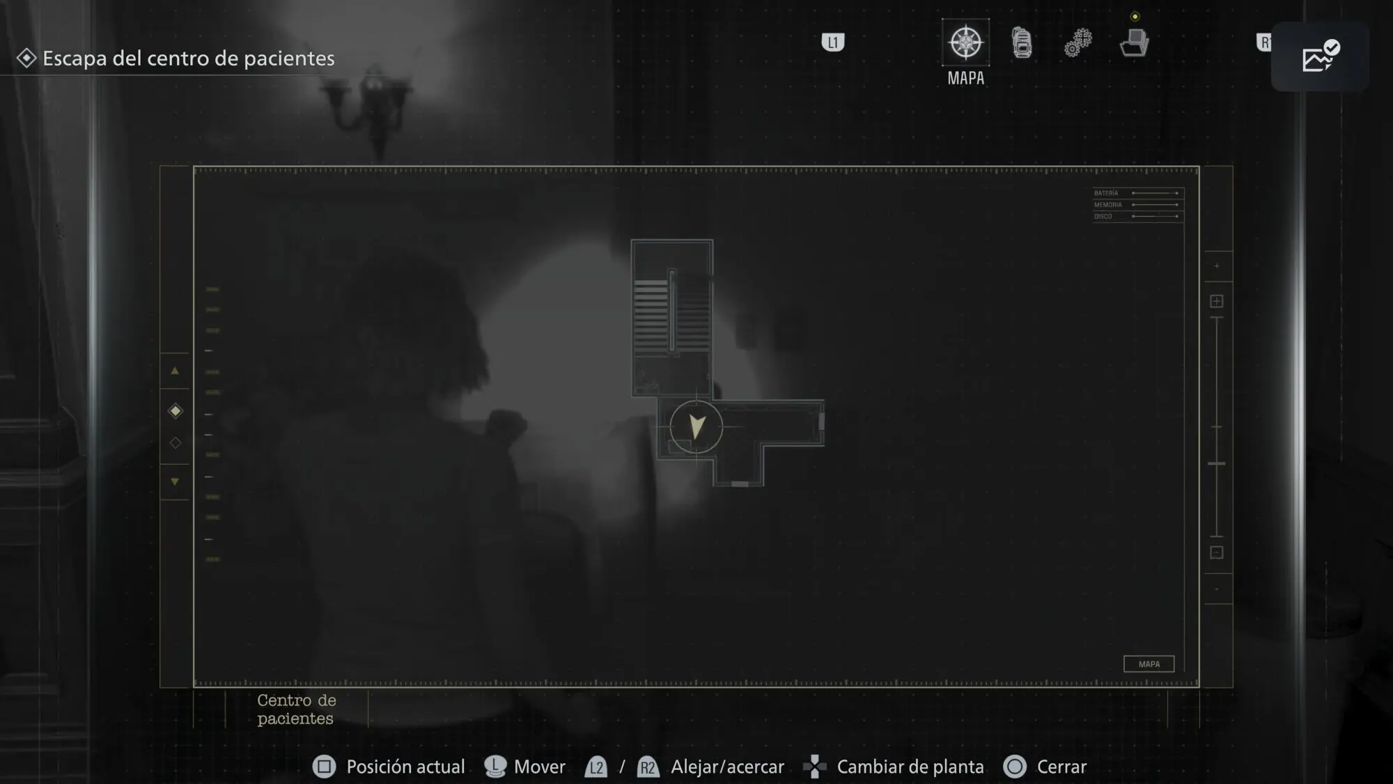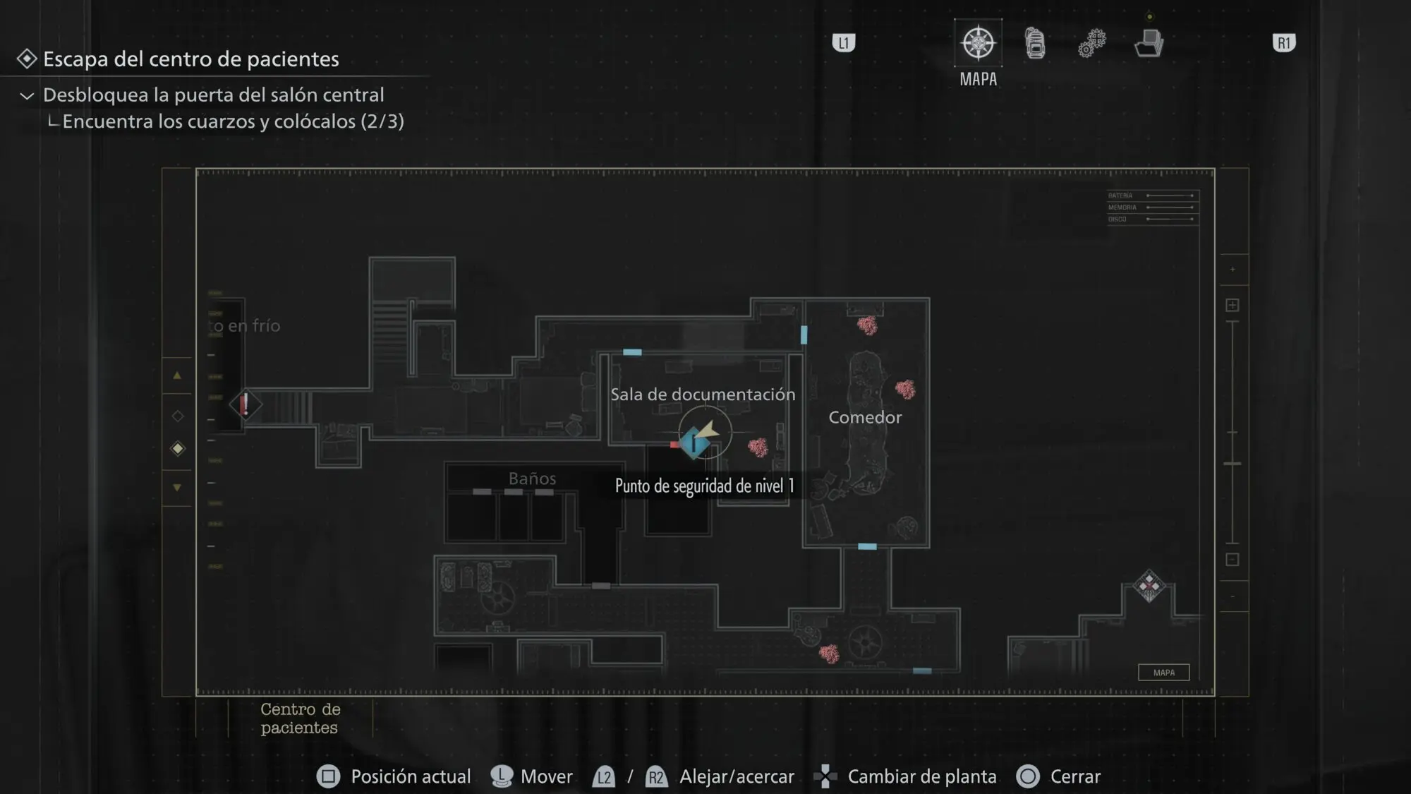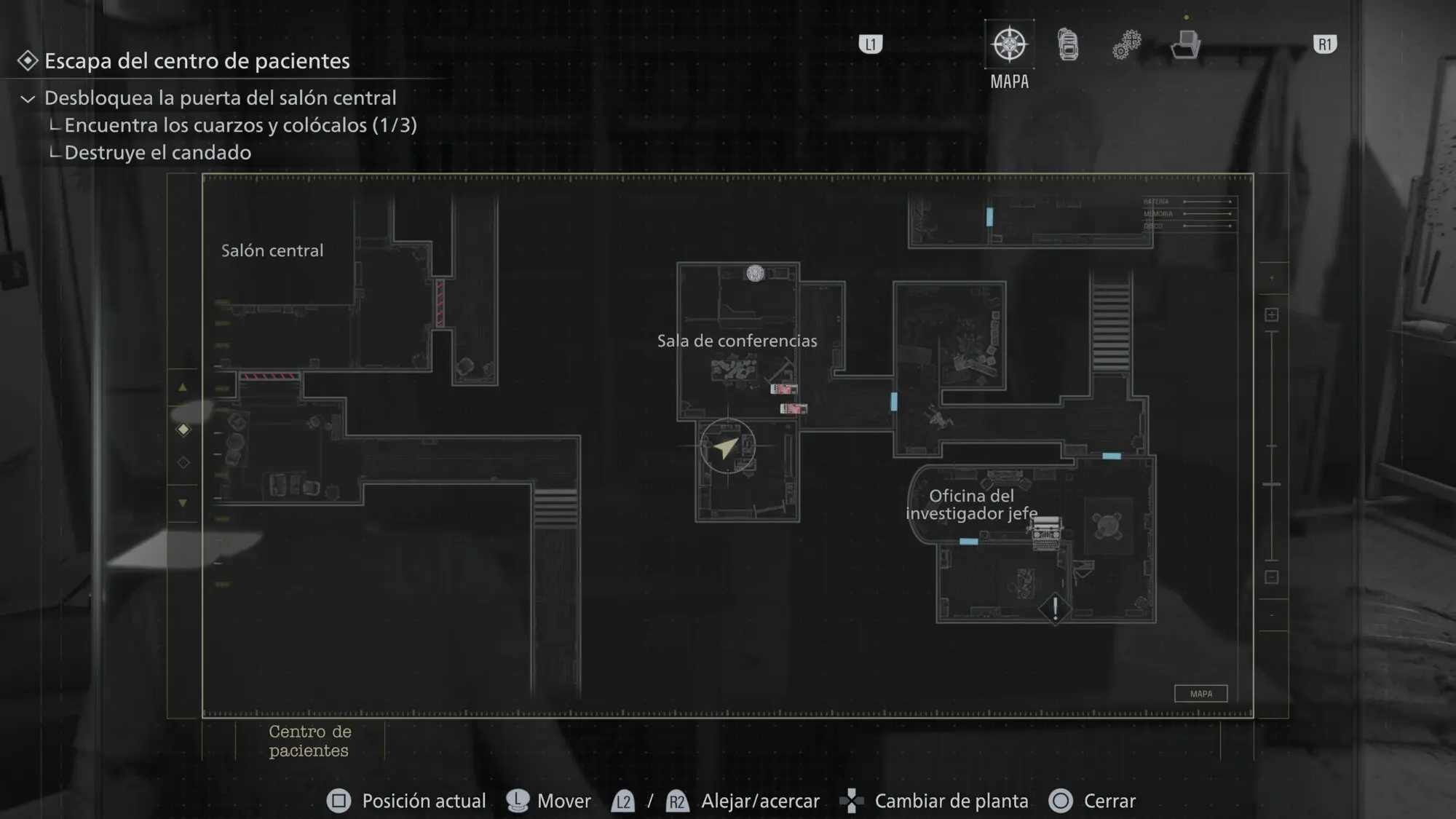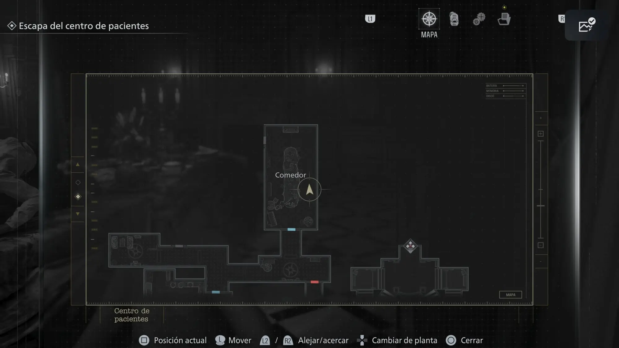 El mapa cambia radicalmente. Donde Leon operaba en la Unidad de rehabilitación con pasillos amplios y marcadores de enemigos, ahora Grace está de pie en el Salón central — la gran sala neoclásica con cúpula, columnas y araña colgante que desde la perspectiva de Leon era solo el hall de entrada. Desde la planta superior, con la pistola en la mano y las heridas todavía visibles, el edificio se ve completamente diferente. Más grande. Más abierto. Y el objetivo ya no es investigar: es salir.