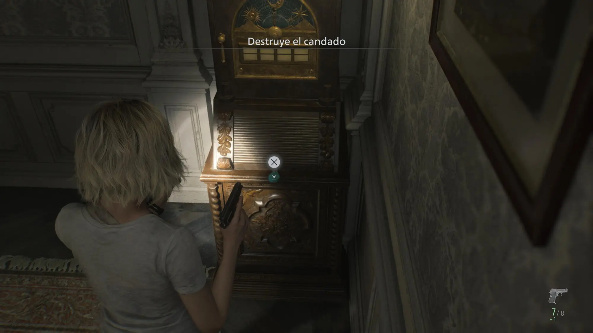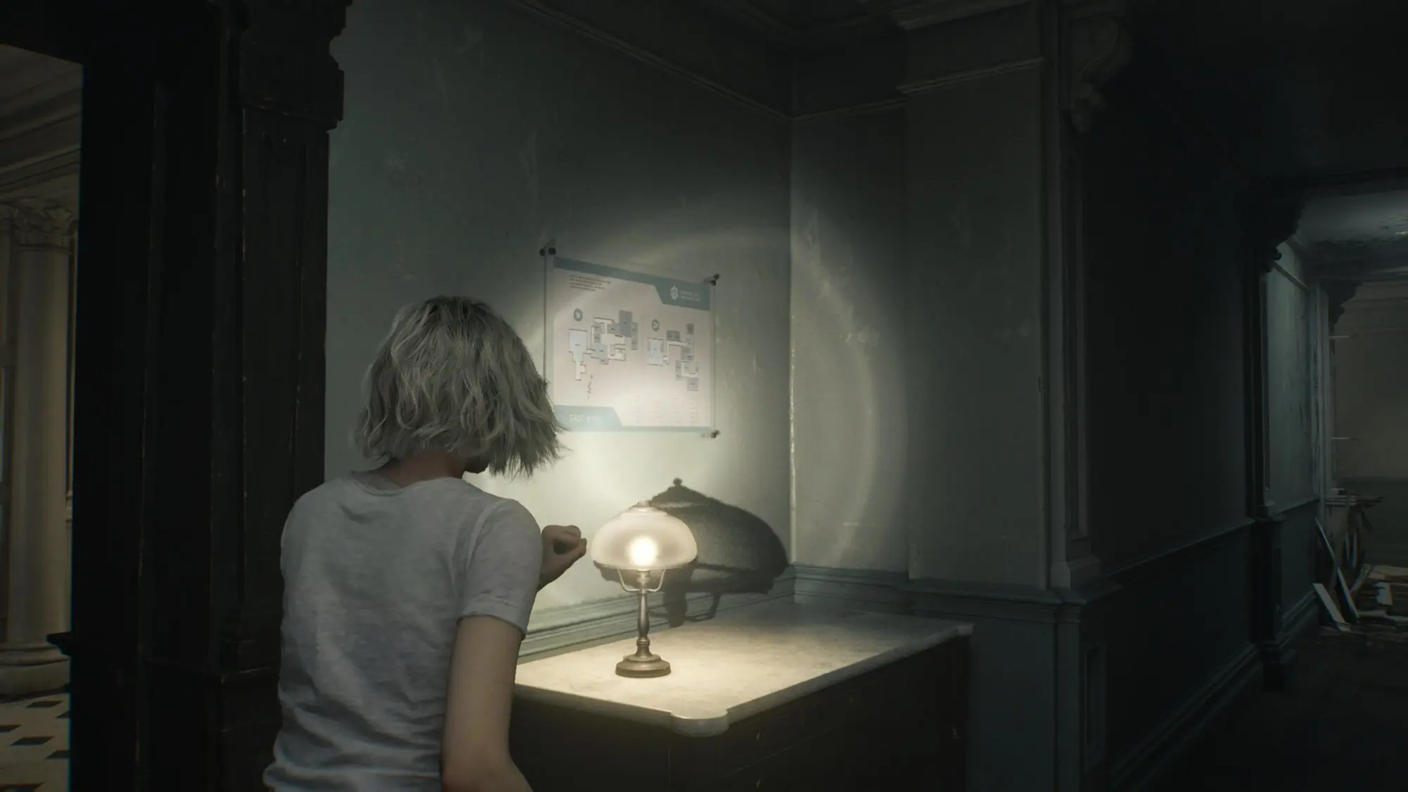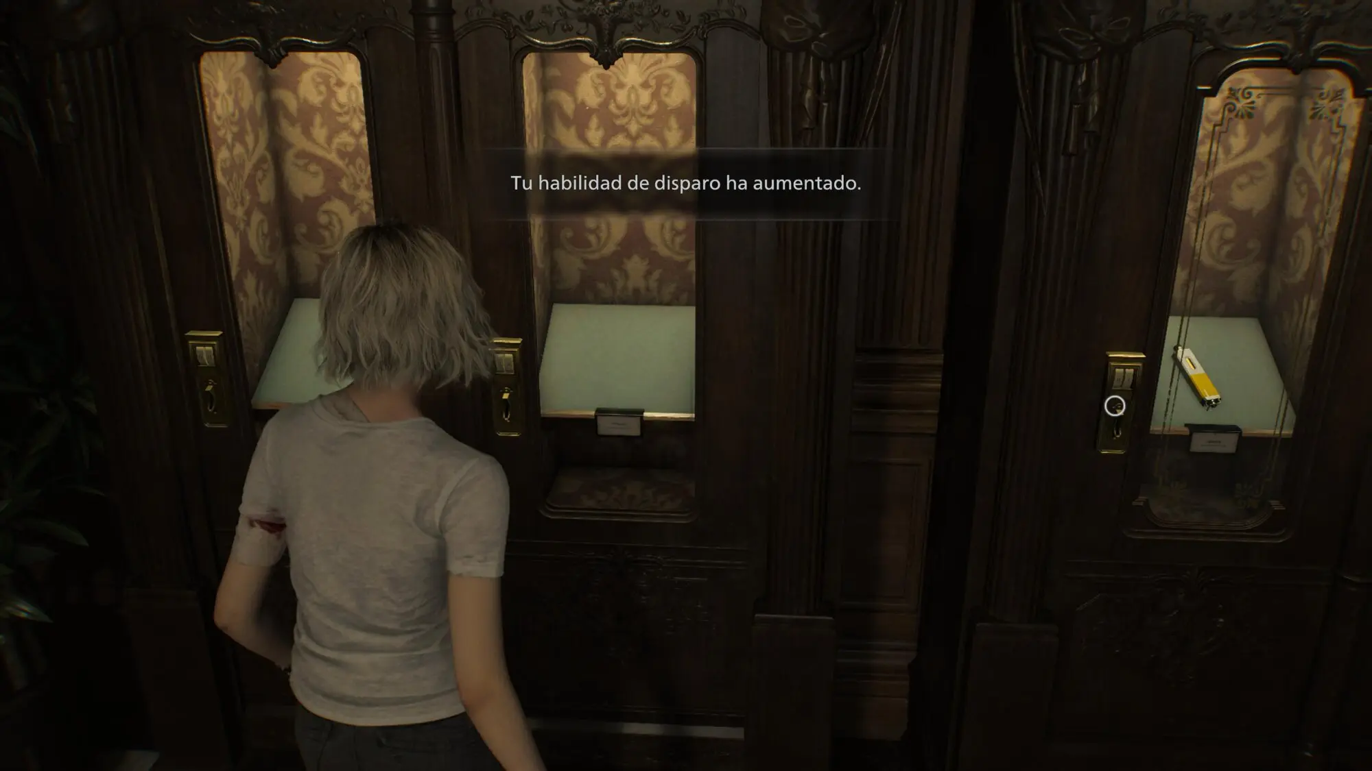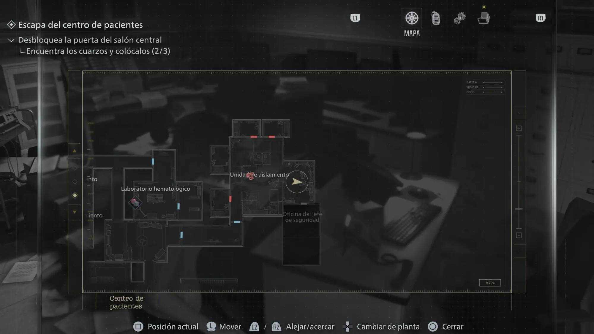 El mapa cambia radicalmente. Donde Leon operaba en la Unidad de rehabilitación con pasillos amplios y marcadores de enemigos, ahora Grace está de pie en el Salón central — la gran sala neoclásica con cúpula, columnas y araña colgante que desde la perspectiva de Leon era solo el hall de entrada. Desde la planta superior, con la pistola en la mano y las heridas todavía visibles, el edificio se ve completamente diferente. Más grande. Más abierto. Y el objetivo ya no es investigar: es salir.