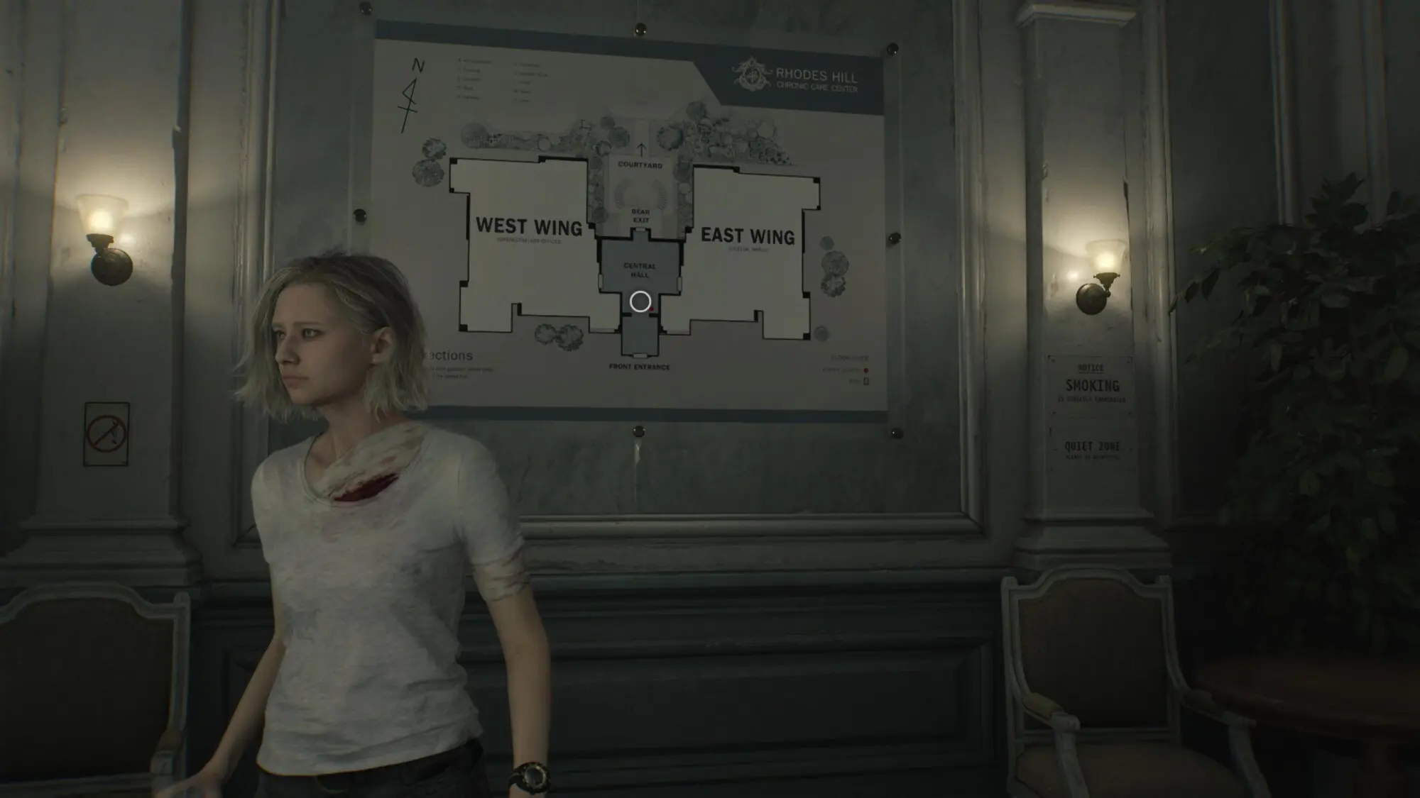 En la pared del hall hay un plano oficial del Rhodes Hill Chronic Care Center que lo explica todo de golpe: el edificio tiene forma de cruz. El Salón central en el medio, la entrada principal al sur, el patio trasero al norte con una salida trasera, el Ala este a la derecha con las salas hospitalarias, y el Ala oeste a la izquierda con las oficinas de administración. La salida más directa pasa por una de las dos alas. Ninguna está abierta todavía.