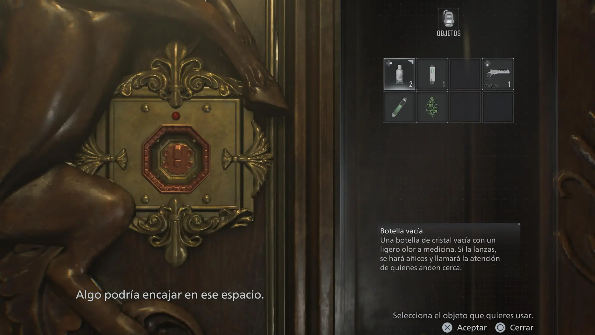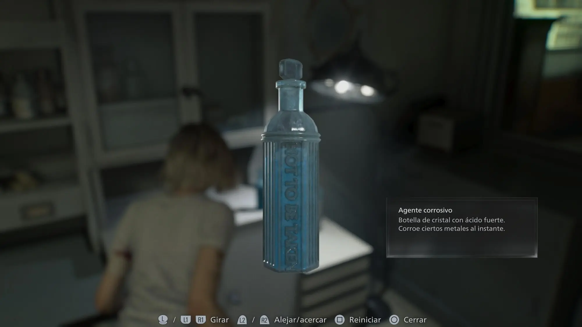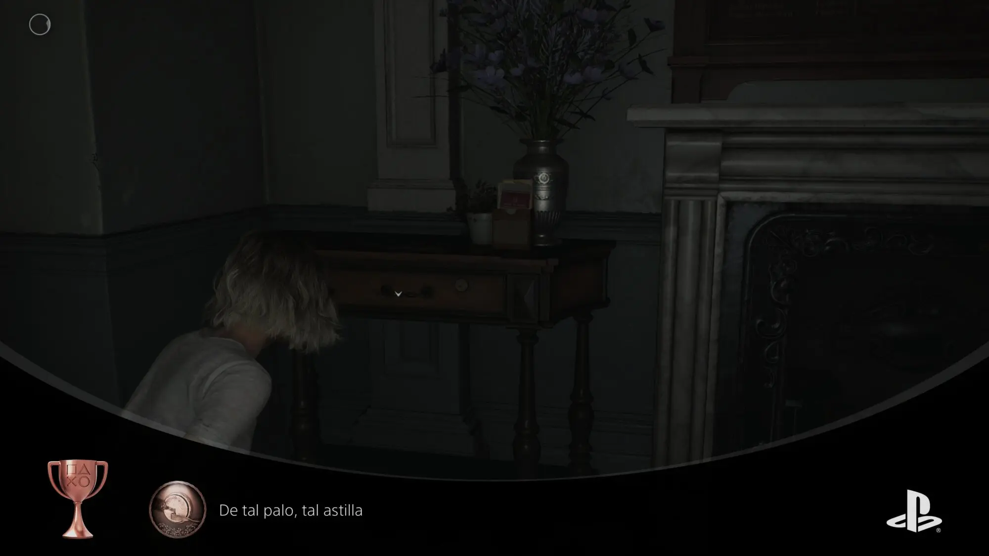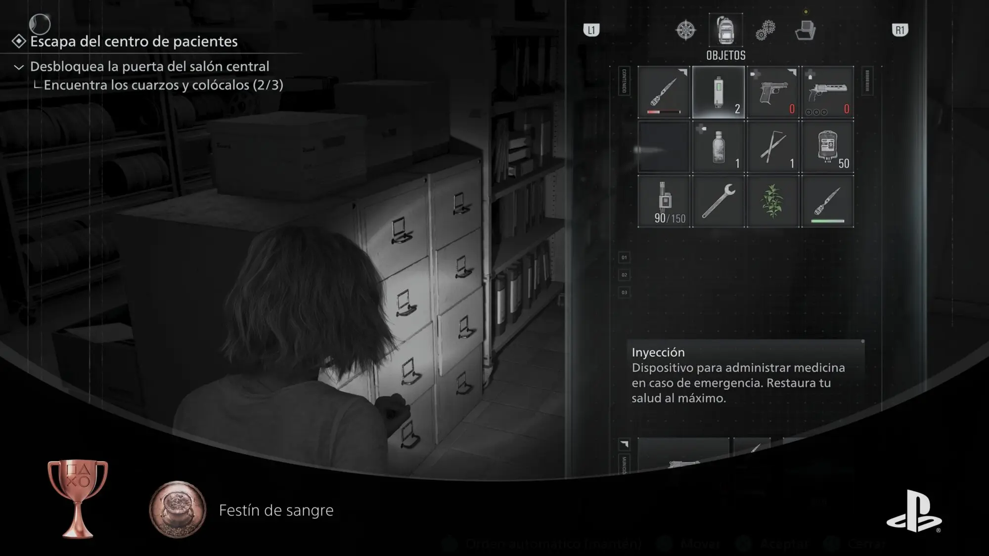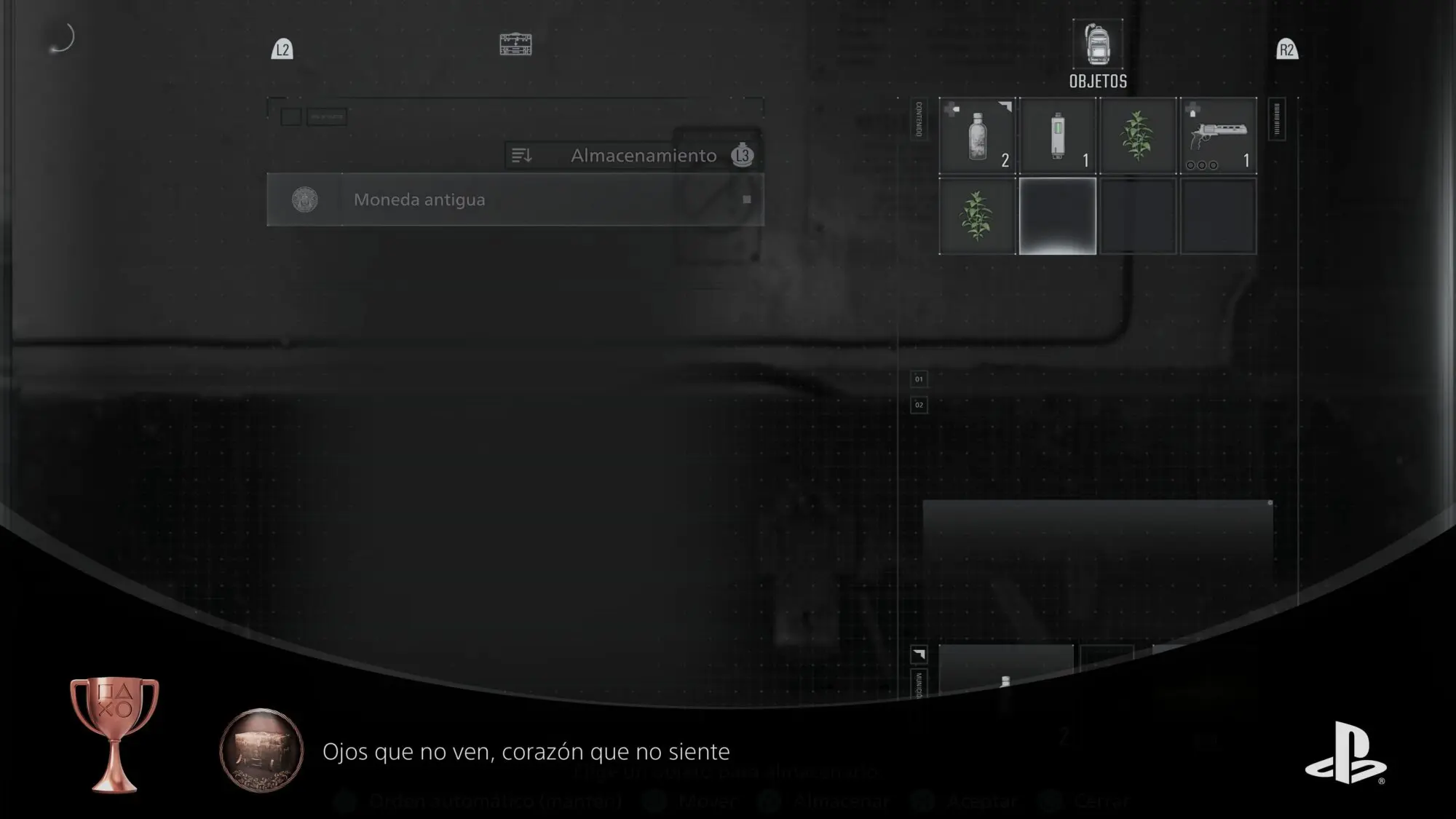 La segunda es el acceso a un punto de almacenamiento, que desbloquea el trofeo de bronce "Ojos que no ven, corazón que no siente". El trofeo se concede en el momento en que Grace interactúa con el sistema de almacenaje por primera vez en este tramo. Además del trofeo, el sistema muestra también un sonido de tipo BIEN junto a la botella vacía, lo que sugiere que hay objetos en el entorno pendientes de combinar o mejorar.