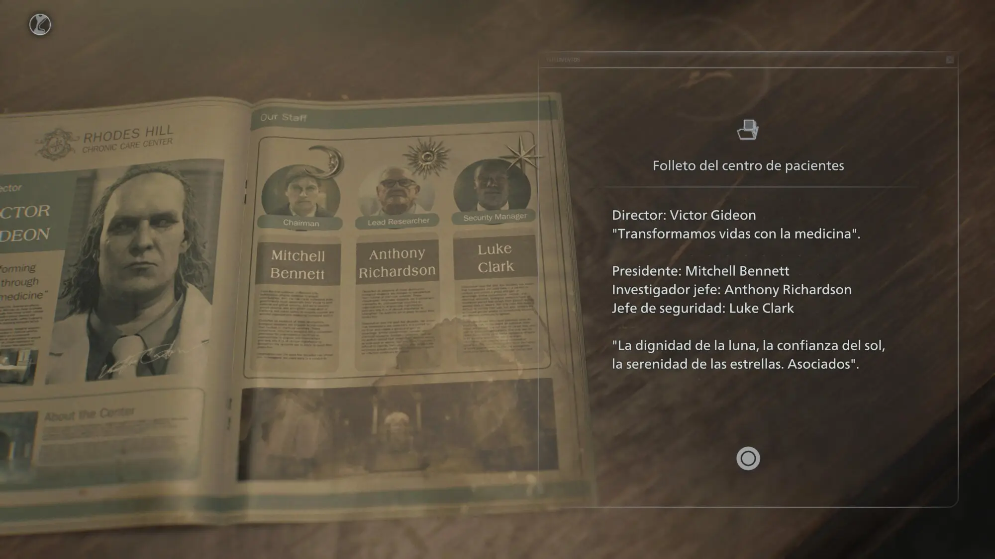 | Folleto del centro de pacientes | Sala adyacente al Salón central | Solución del puzzle luna/sol/estrella + lore clave sobre los tres directivos |