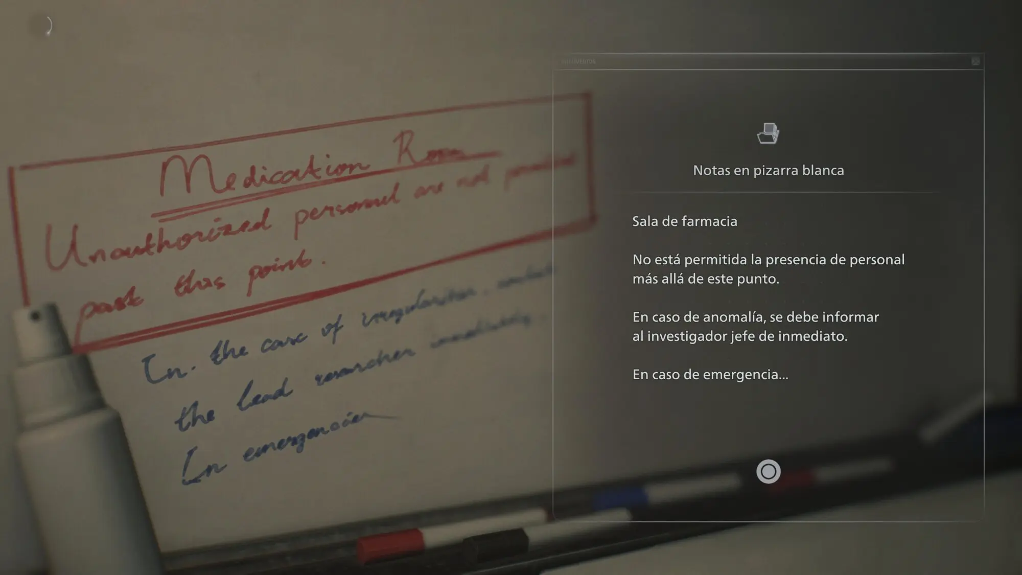 | Notas en pizarra blanca | Sala interior con acceso restringido | Lore sobre la sala de farmacia y el protocolo del investigador jefe |