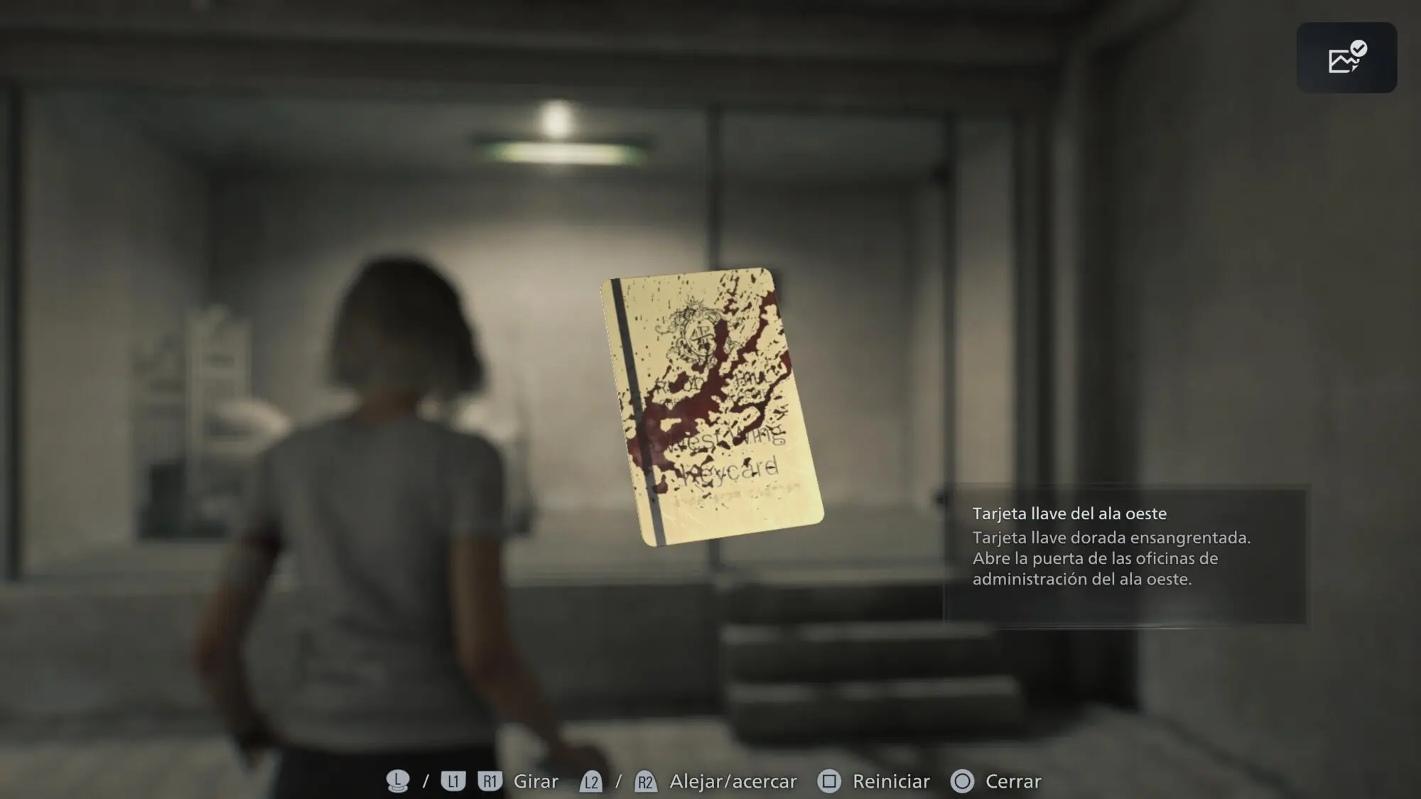 Siguiendo la exploración de la sala donde está la niña, Grace encuentra el objeto que abre la siguiente fase del escape: la Tarjeta llave del ala oeste. La descripción lo confirma sin ambigüedades: "Tarjeta llave dorada ensangrentada. Abre la puerta de las oficinas de administración del ala oeste." La sangre que la cubre y la procedencia — cerca de un cadáver masculino en el suelo examinado por Grace, con la observación "Algo afilado le ha desgarrado la piel" — añaden contexto sin necesitar más explicación. Alguien murió aquí con esa tarjeta encima.