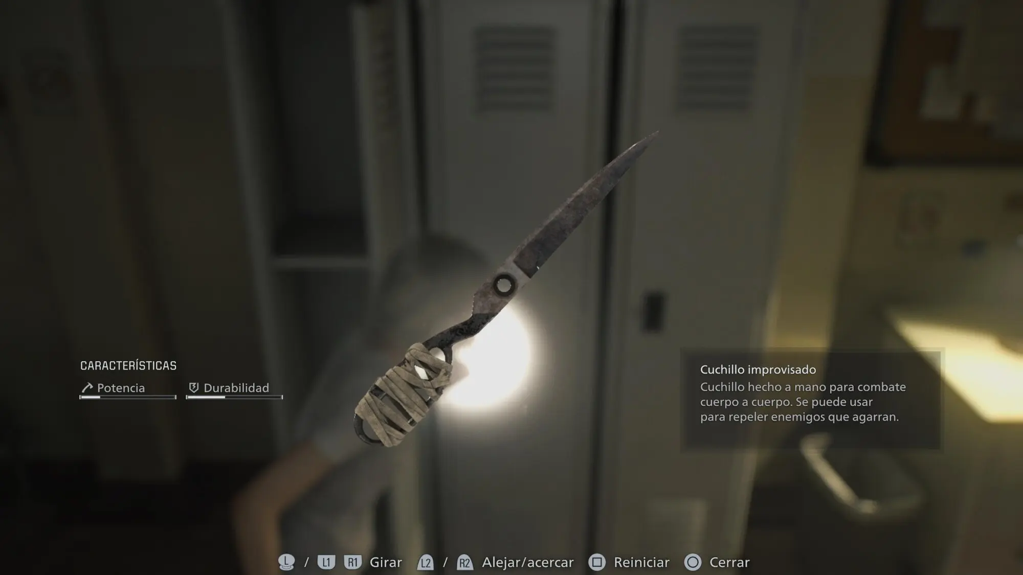 La segunda es un Cuchillo improvisado — "Cuchillo hecho a mano para combate cuerpo a cuerpo. Se puede usar para repeler enemigos que agarran." Mango envuelto en tela, hoja sin acabado, el tipo de objeto que alguien fabricó con lo que tenía a mano. Su función principal es salir de un agarre sin gastar munición — úsalo cuando un infectado te sujete en lugar de forcejear.