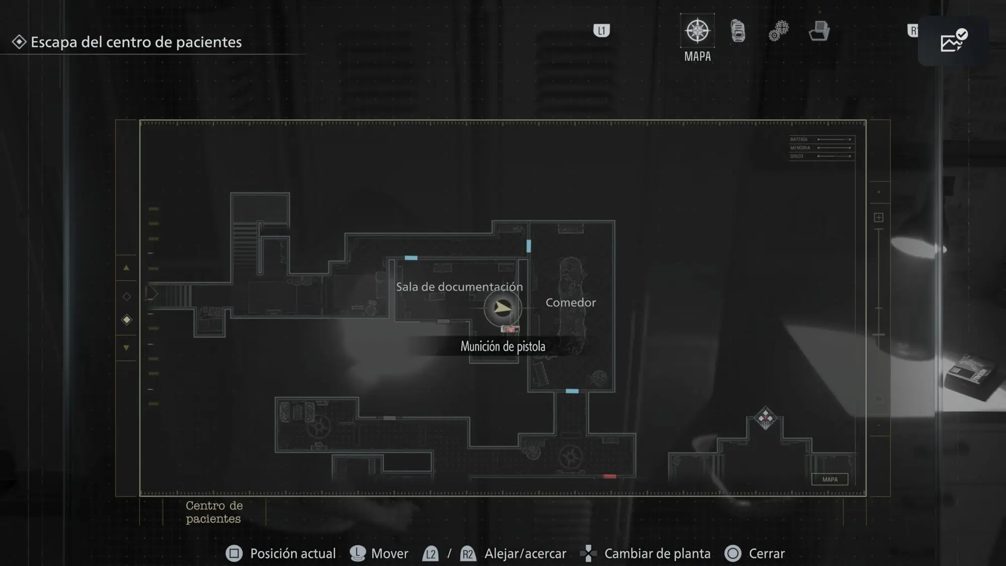 | Comedor / Sala de documentación | Munición de pistola marcada en el mapa, mapa del ala | Zona de tránsito central — marcador de munición visible en el minimapa |