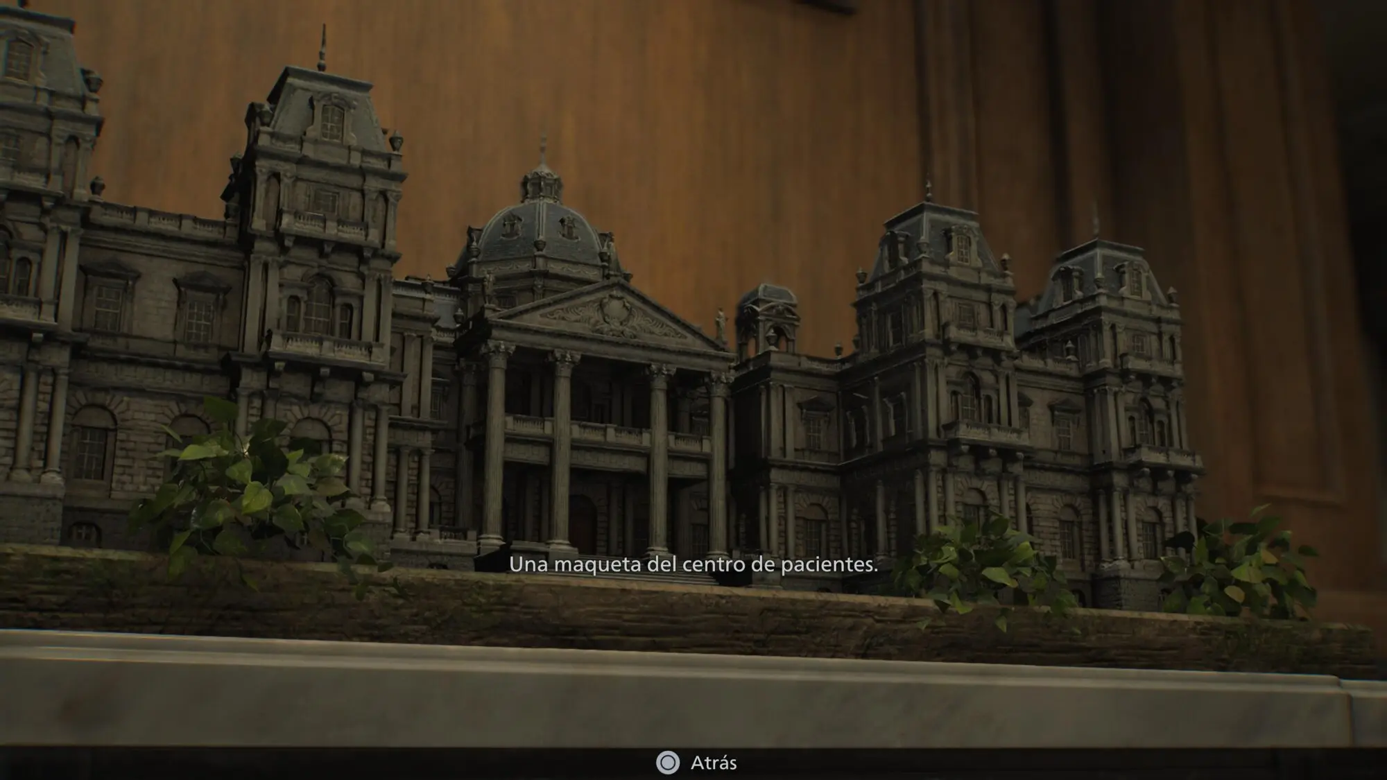 El ala oeste tiene dos objetos de inspección que merecen atención especial. El primero es una maqueta arquitectónica a escala del Rhodes Hill Chronic Care Center — el edificio completo en miniatura, con su cúpula central, las dos alas simétricas y la fachada neoclásica — que Grace puede examinar con la indicación "Una maqueta del centro de pacientes." No es un objeto recogible pero confirma visualmente la grandeza institucional que tuvo este lugar antes de que todo se fuera al traste. Alguien invirtió mucho dinero en esta fachada.
