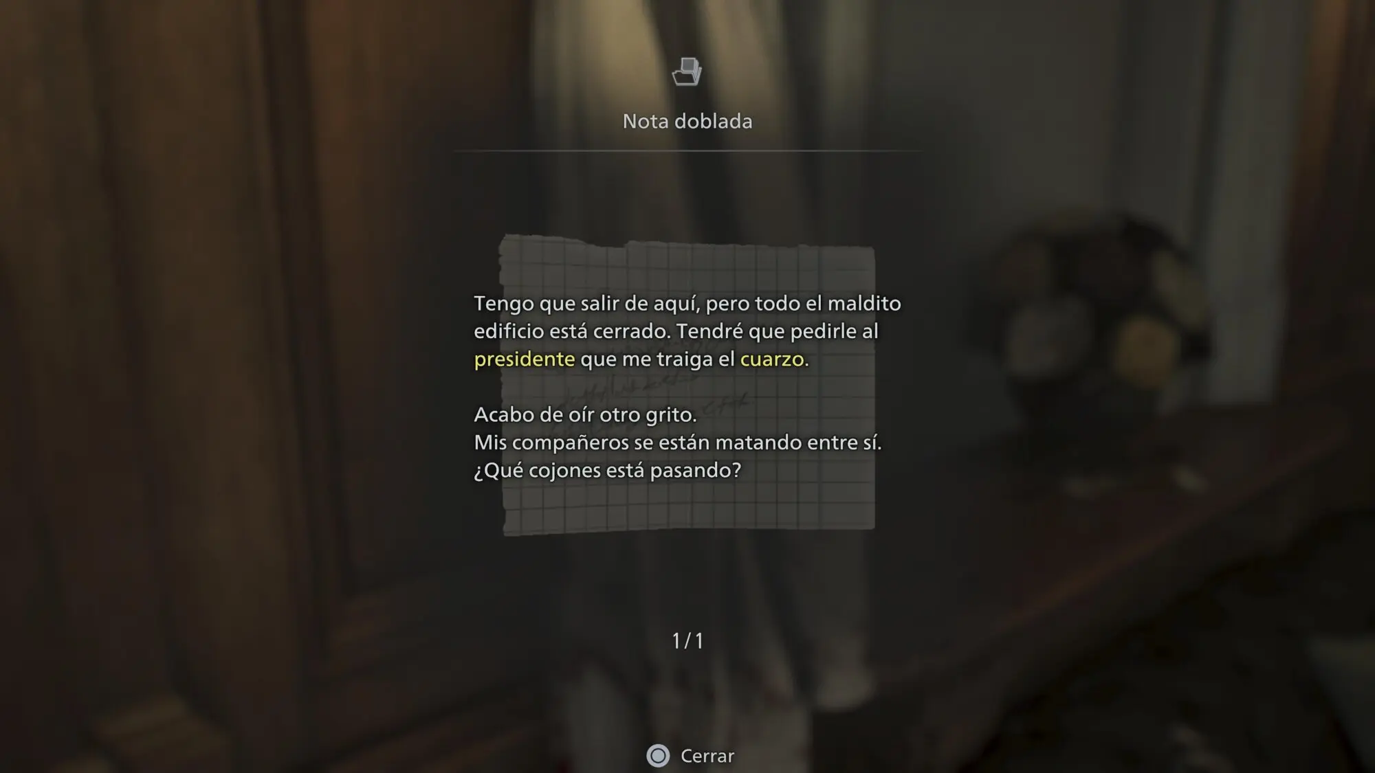 En uno de los despachos del ala oeste, sobre una mesa cerca de una figura con ropa sangrienta caída al suelo, Grace encuentra una nota doblada escrita en papel cuadriculado. El texto es breve y no necesita explicación: "Tengo que salir de aquí, pero todo el maldito edificio está cerrado. Tendré que pedirle al presidente que me traiga el cuarzo. Acabo de oír otro grito. Mis compañeros se están matando entre sí. ¿Qué cojones está pasando?"
