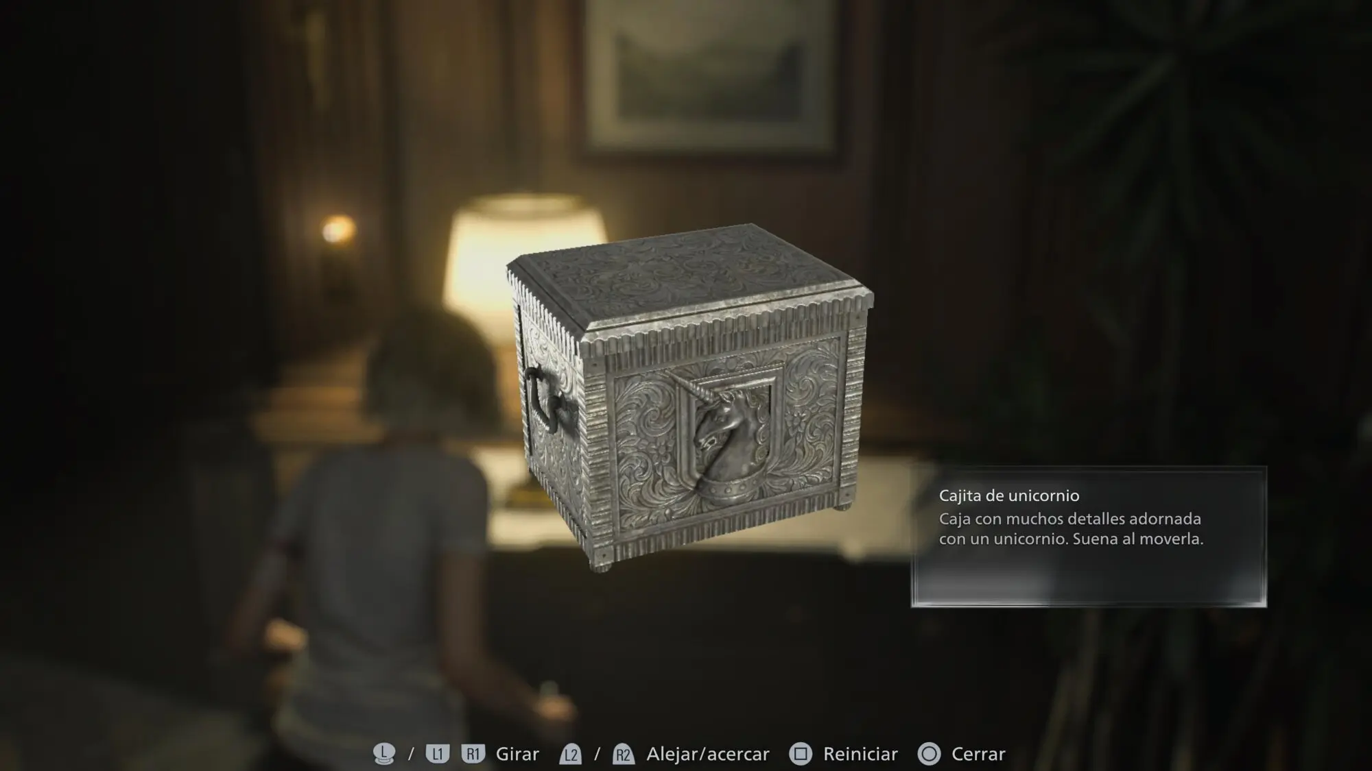 El segundo es la Cajita de unicornio — "Caja con muchos detalles adornada con un unicornio. Suena al moverla." Es un objeto de puzles de esos que esconden algo dentro y que el juego te deja examinar desde todos los ángulos antes de darte la solución. Hay algo en su interior que se mueve cuando la orientas. Dale vueltas con los controles de rotación — la lógica es la misma que en otros objetos examinables de la saga.