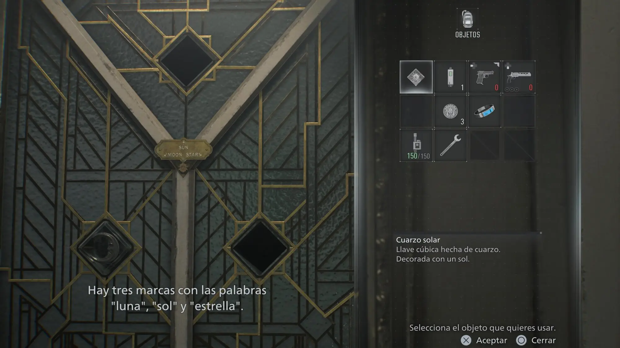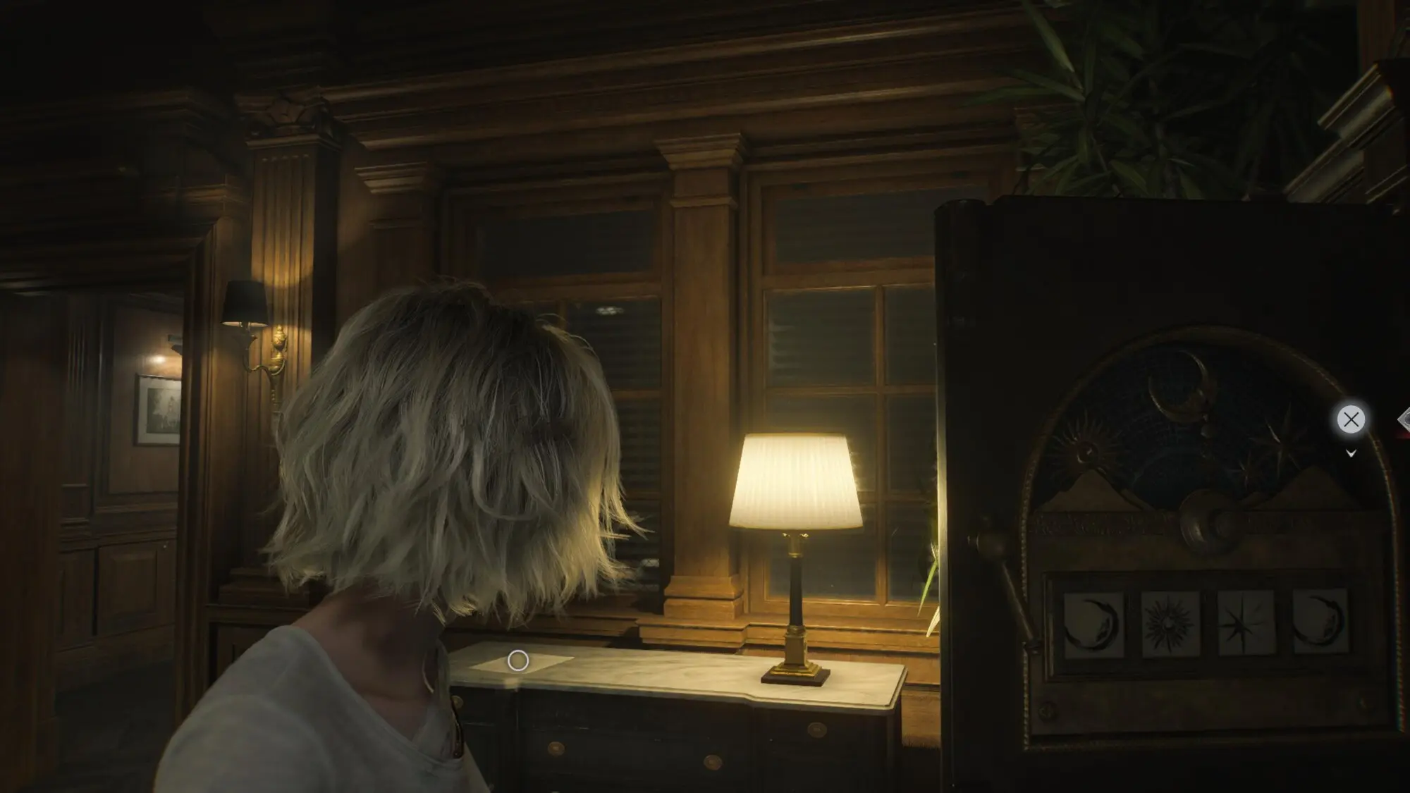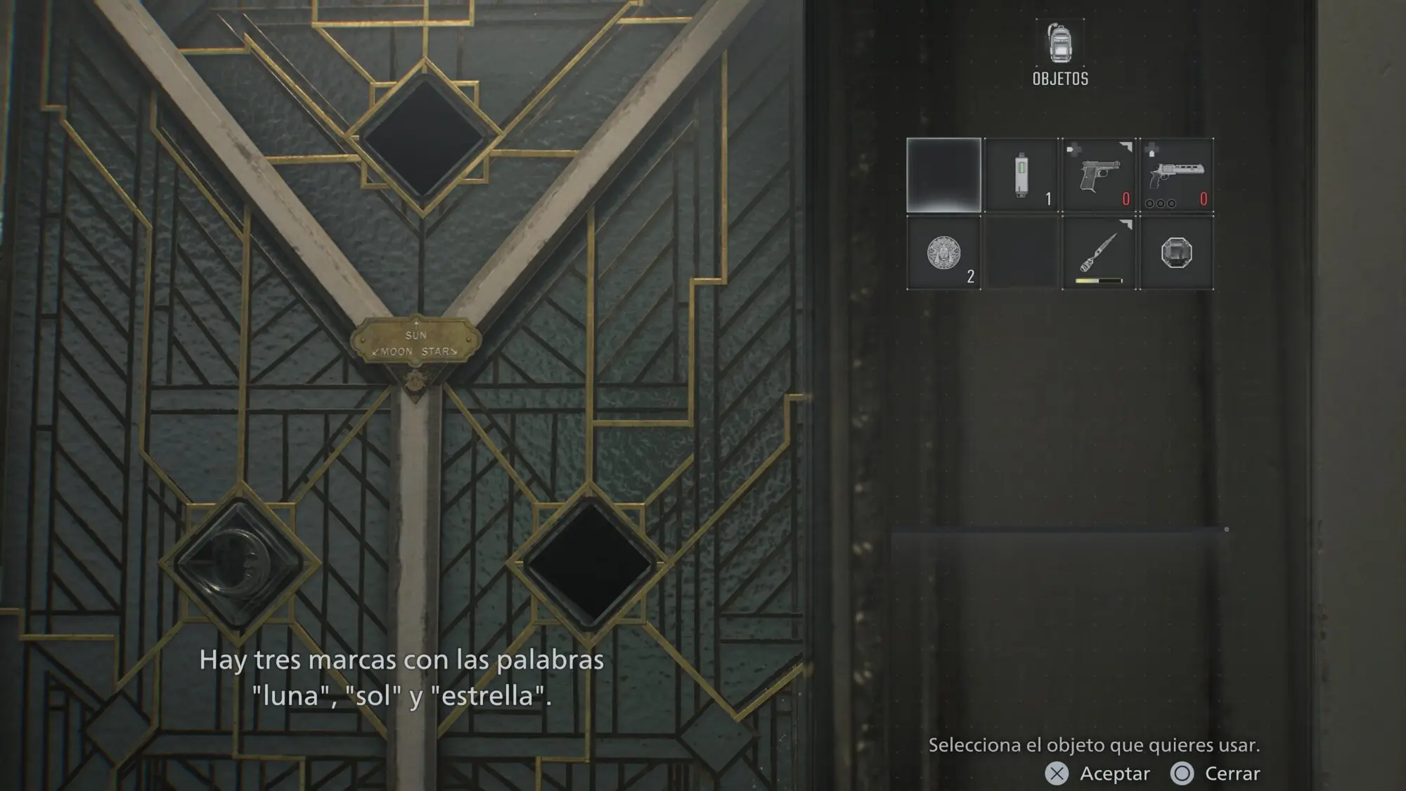 Antes de poder moverse por el edificio, Grace se topa con una puerta interior bloqueada con un panel decorativo de estilo art déco: diseño geométrico en verde y dorado con cuatro rombos negros y una pequeña placa dorada en el centro que muestra tres palabras en orden — SUN, MOON, STAR — con un indicador que parece estar apuntando actualmente a MOON. El juego lo confirma en texto: "Hay tres marcas con las palabras 'luna', 'sol' y 'estrella'."