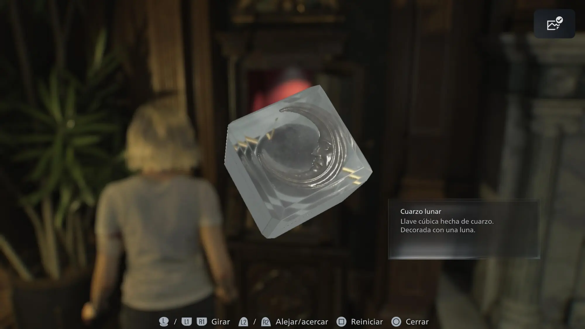 Una vez introducida la combinación correcta, la caja fuerte se abre. Dentro, sobre un pedestal rojo, espera el objeto que la nota doblada mencionaba: el Cuarzo lunar — "Llave cúbica hecha de cuarzo. Decorada con una luna." Un cubo traslúcido de cuarzo con una luna creciente grabada en la cara principal, guardado en una vitrina iluminada en rojo. Es exactamente el objeto que encaja en el mecanismo dorado de la puerta con el hueco octogonal que encontraste antes en el ala oeste.
