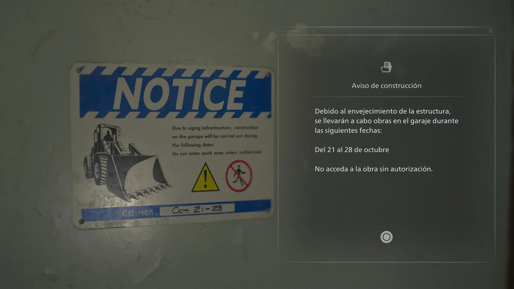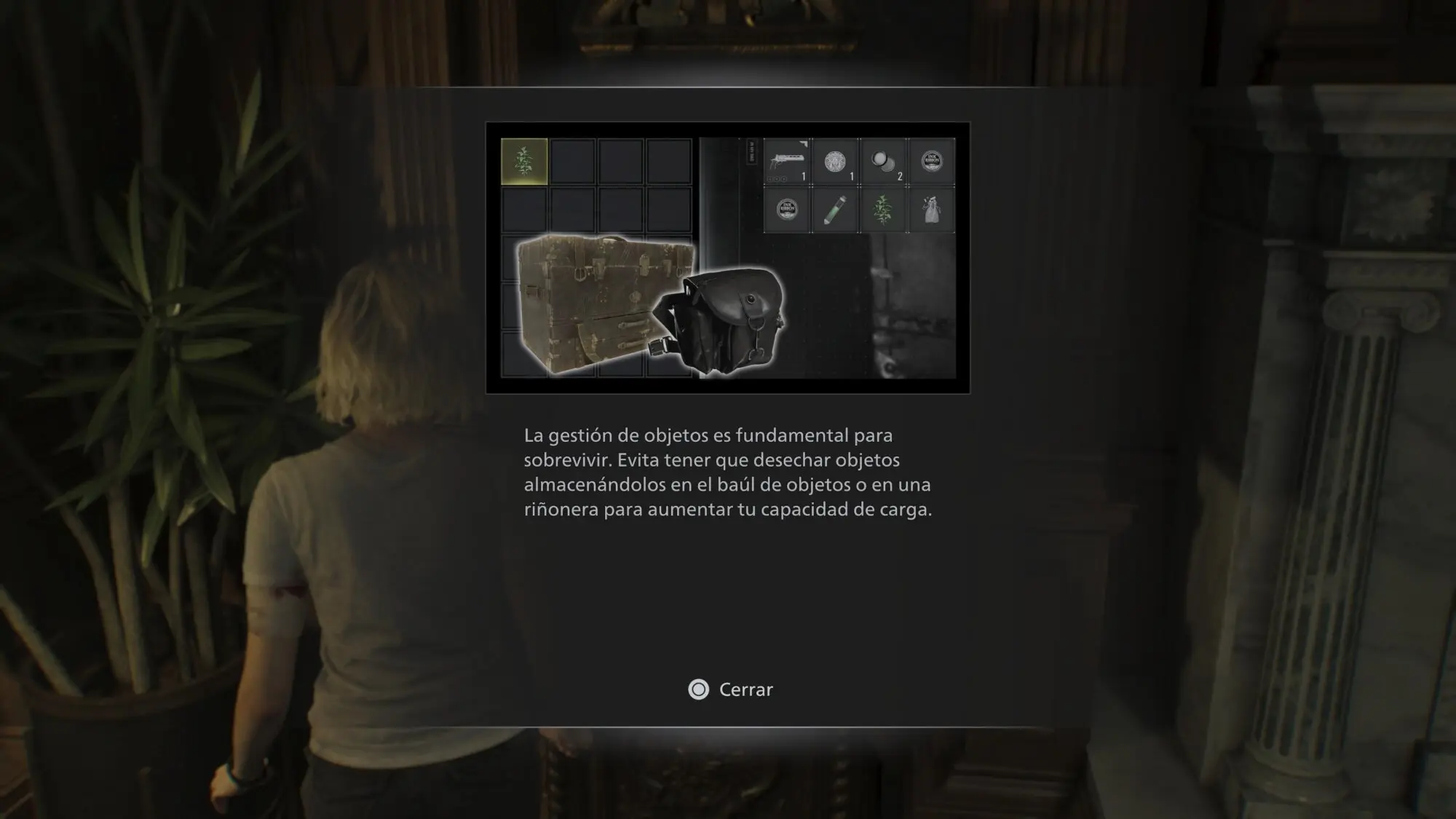 Al abrirse la caja fuerte o al recoger el cuarzo lunar, el juego muestra un recordatorio sobre la gestión de objetos — una pantalla de tutorial que aparece en este punto posiblemente porque el inventario de Grace empieza a estar lleno. El mensaje es claro: "La gestión de objetos es fundamental para sobrevivir. Evita tener que desechar objetos almacenándolos en el baúl de objetos o en una riñonera para aumentar tu capacidad de carga." El baúl de objetos está disponible en los puntos de almacenamiento del edificio. Las riñoneras son objetos que amplían el número de casillas del inventario cuando se equipan.