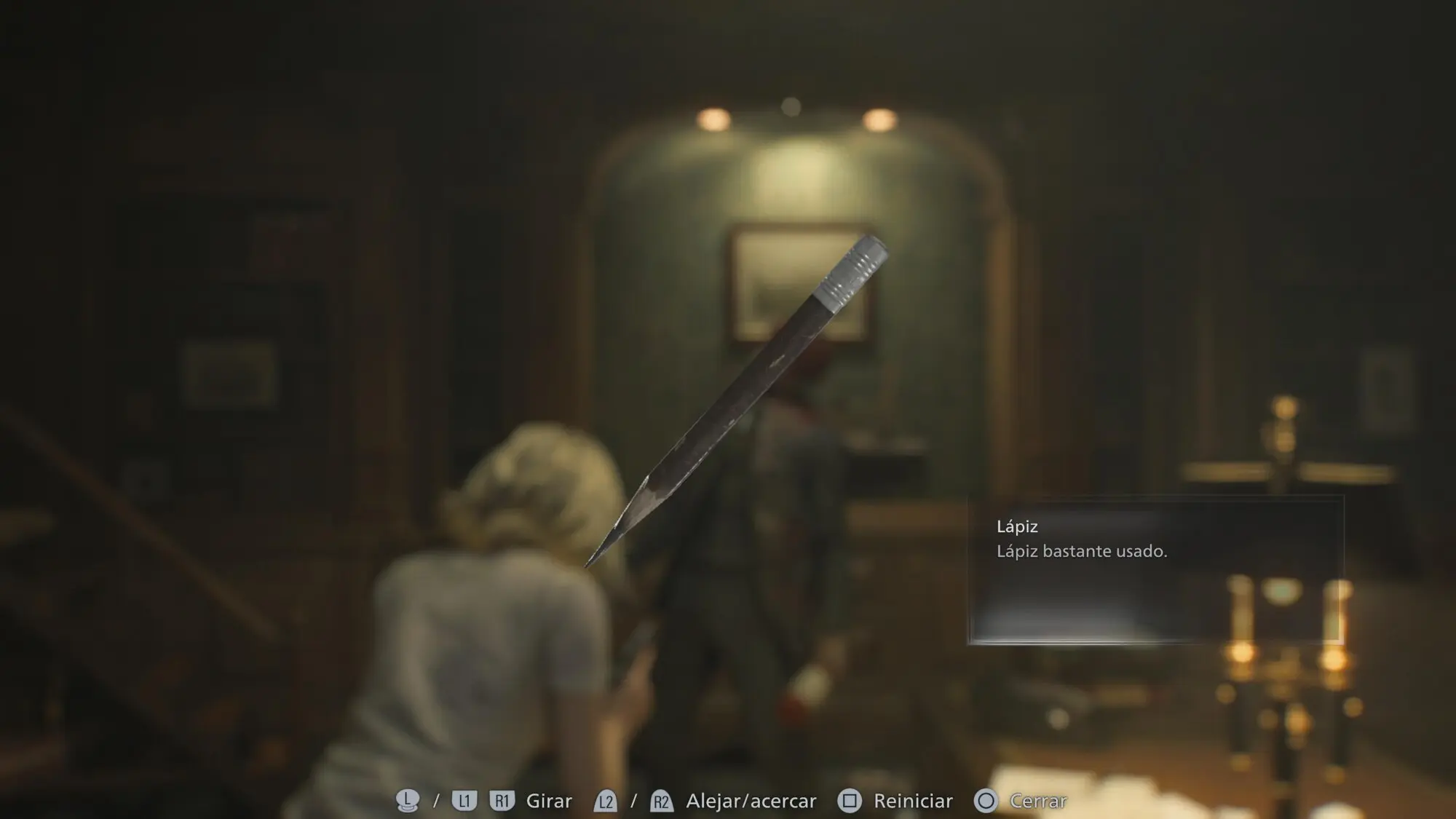 La segunda es el Lápiz — "Lápiz bastante usado." — que aparece como objeto recogible en la galería adyacente. En principio parece intrascendente, pero en el contexto del libro de espiral que Grace también puede encontrar en el ala oeste — páginas en blanco con "Hay marcas de escritura" — el lápiz sirve para revelar el texto oculto mediante la técnica del frotado. Con el lápiz seleccionado, úsalo sobre el libro para ver qué hay escrito en las páginas que parecen vacías.
