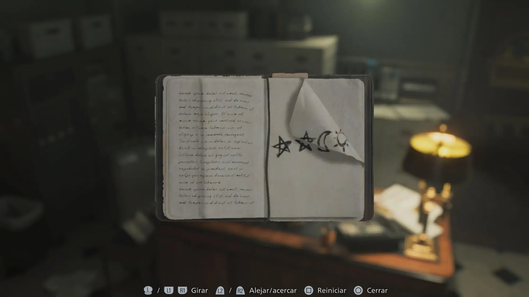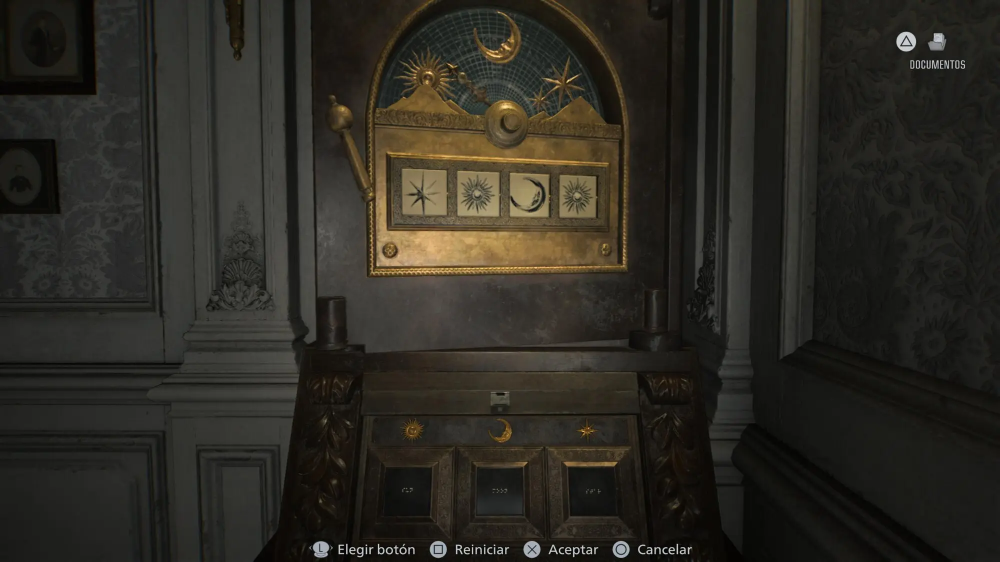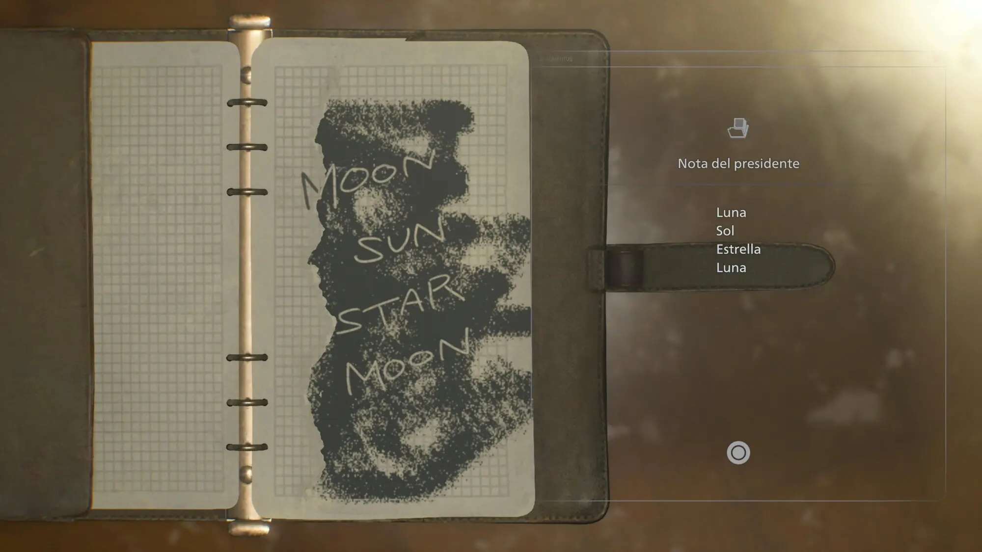 La caja fuerte tiene cuatro posiciones en la fila superior que hay que configurar correctamente para abrirla. La combinación no es arbitraria — está escrita en el diario del presidente que Grace encuentra en la misma oficina, en una página que muestra una impresión en carboncillo de las palabras escritas con fuerza en papel cuadriculado: MOON / SUN / STAR / MOON. La traducción al español lo confirma: Luna, Sol, Estrella, Luna.