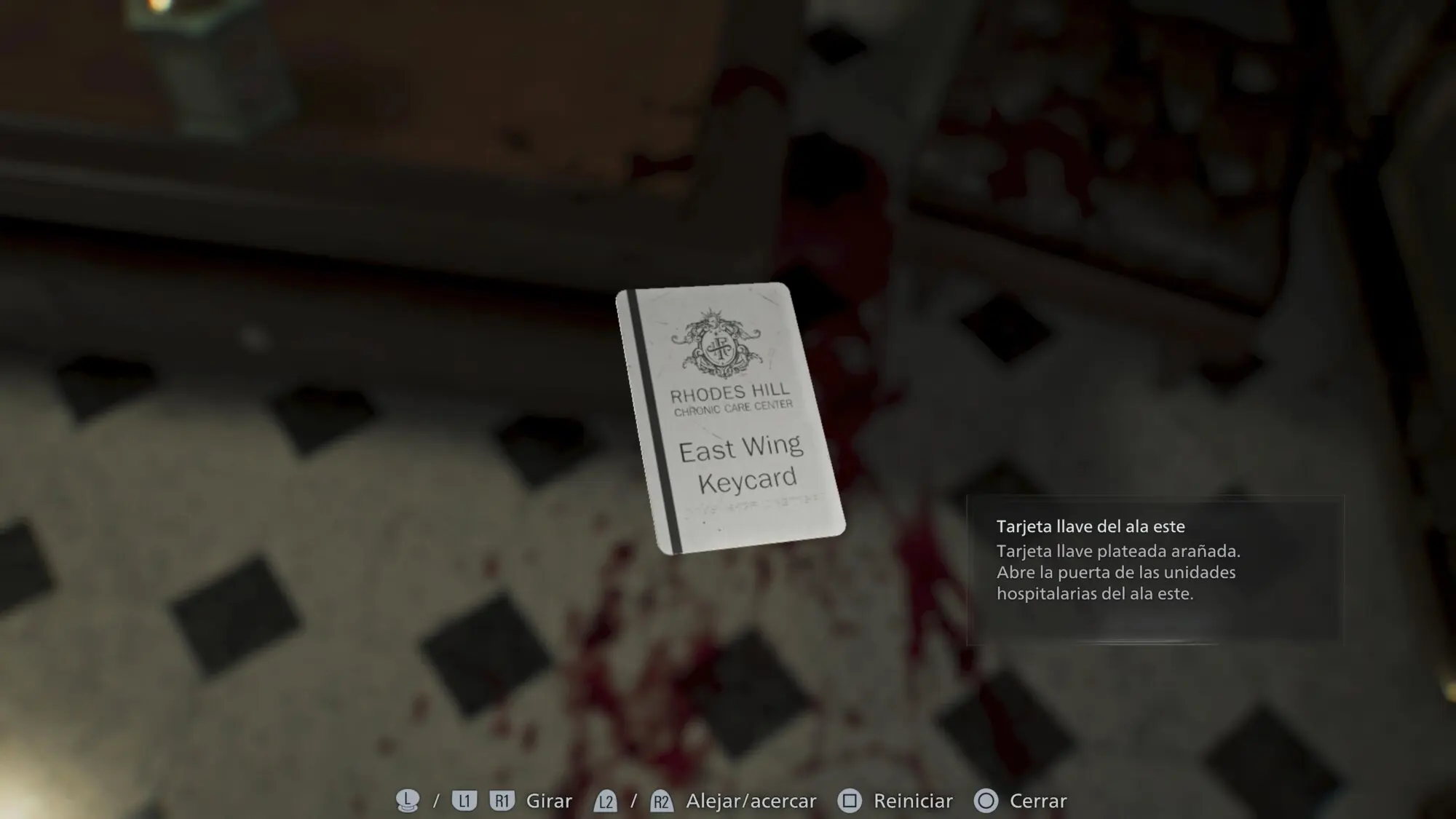 El objeto más importante del tramo es la Tarjeta llave del ala este — una tarjeta plateada arañada con el membrete de Rhodes Hill Chronic Care Center que Grace encuentra en el suelo del Salón de Juegos, entre charcos de sangre. Su descripción es directa: "Abre la puerta de las unidades hospitalarias del ala este."