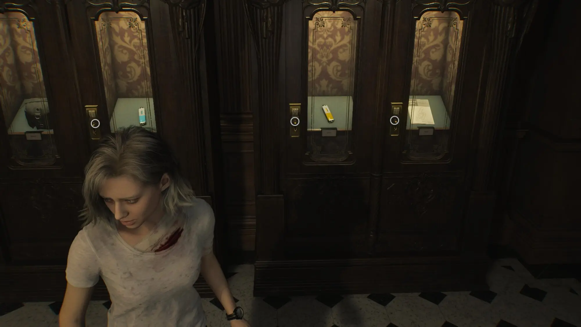 En la Sala de Juegos, Grace encuentra un mueble de vitrinas iluminadas — tres compartimentos de madera oscura con cristal dorado, cada uno cerrado con un mecanismo de combinación numérica, es la tipica 'tienda' que recordamos de otros juegos de la saga donde deberemos introducir el numero de monedas que marca para desbloquearlo. Dentro hay objetos visibles: un inyector hemolítico azul en la vitrina izquierda, algo amarillo en la central, y un documento en la derecha.
