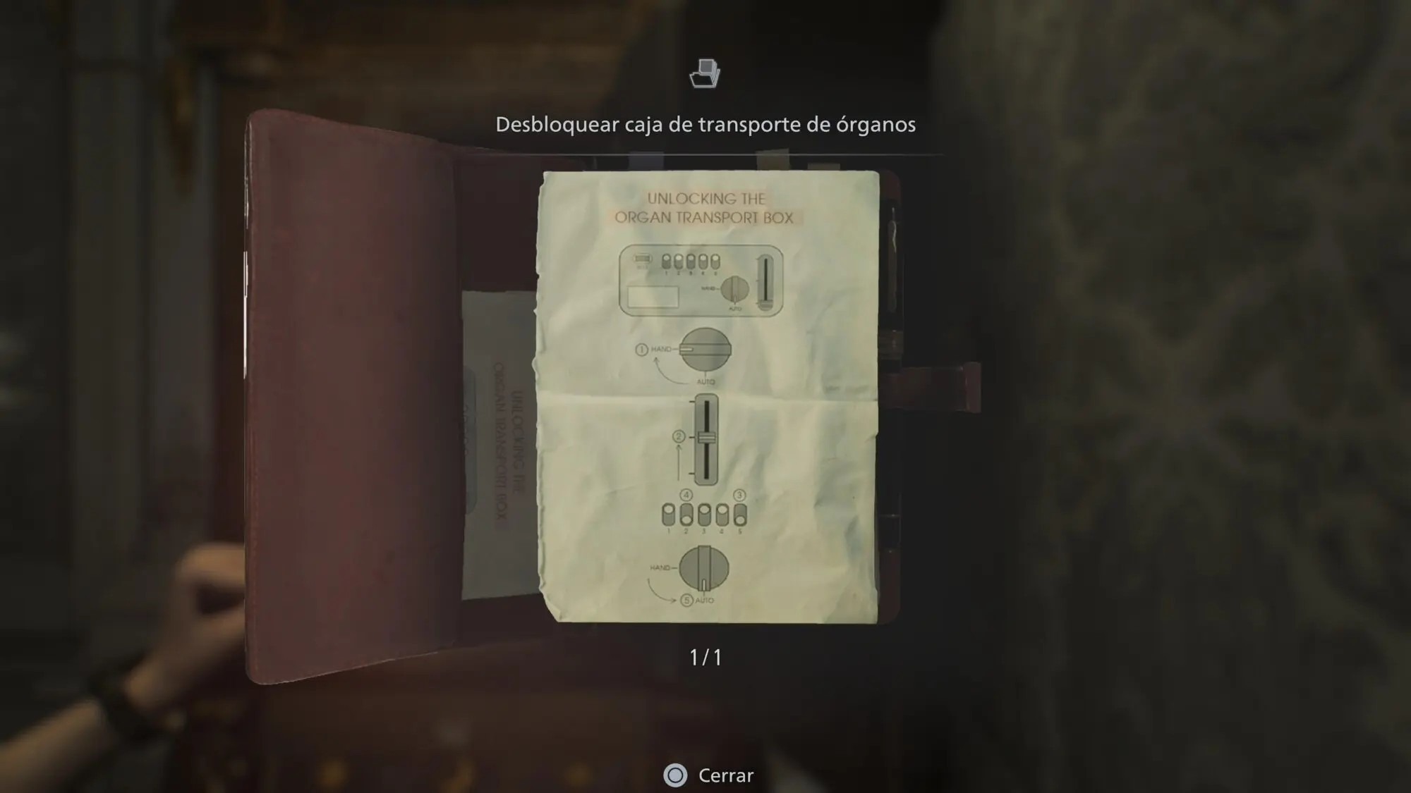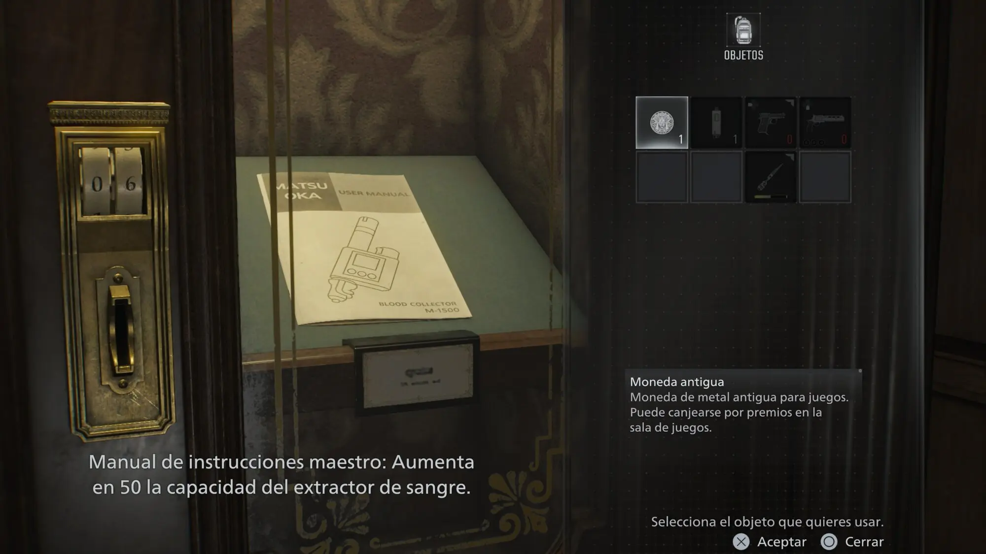 La vitrina central tiene su mecanismo marcado en 06 por lo que para abrirlo deberemos introducir 6 monedas antiguas de las que vamos recogiendo por el mapeado. Dentro hay el Manual de instrucciones maestro del extractor de sangre — una hoja técnica de Matsu Oka que, al usarse, amplía en 50 unidades la capacidad máxima del dispositivo. El juego lo confirma como mejora permanente en el momento de recogerlo.