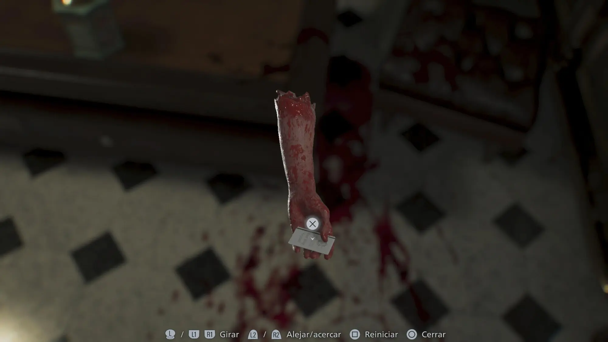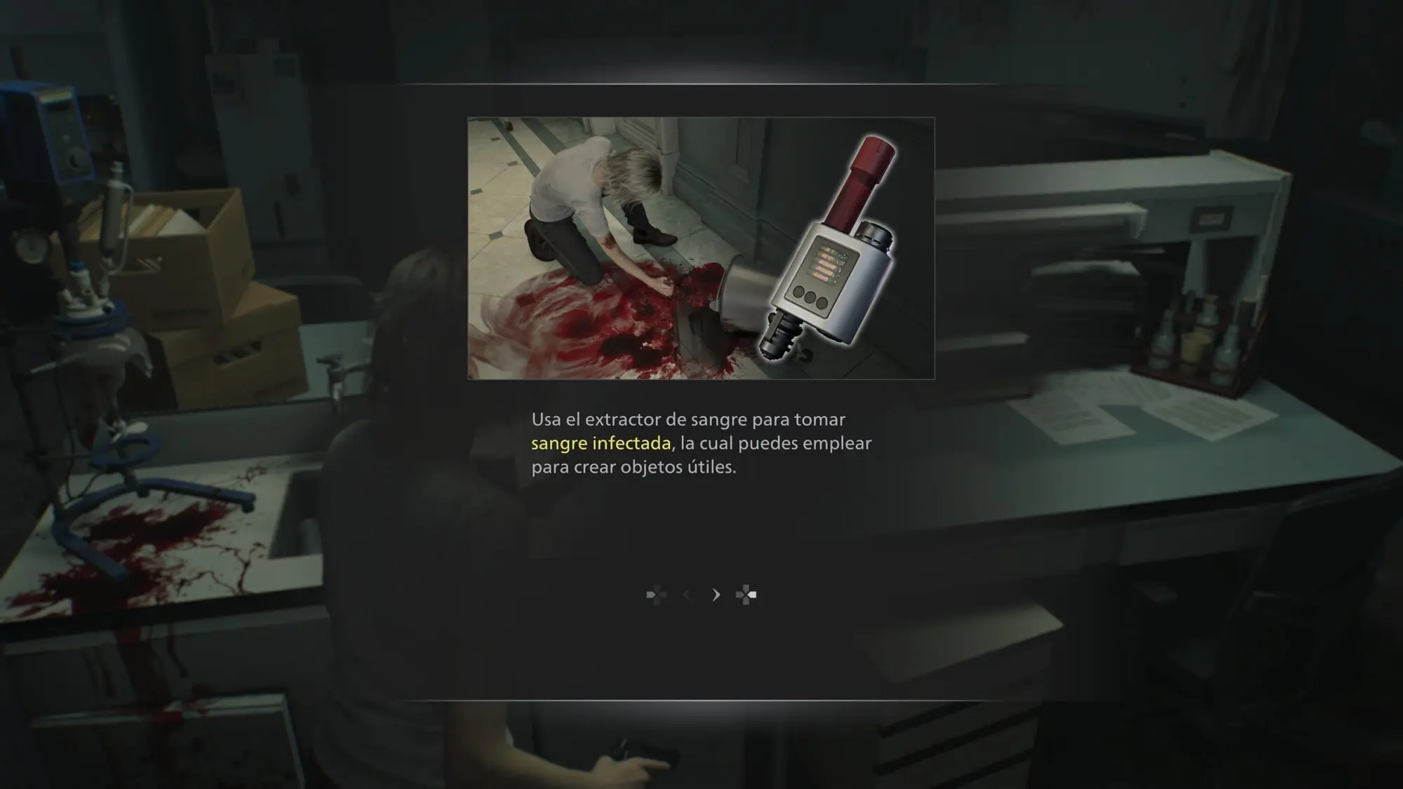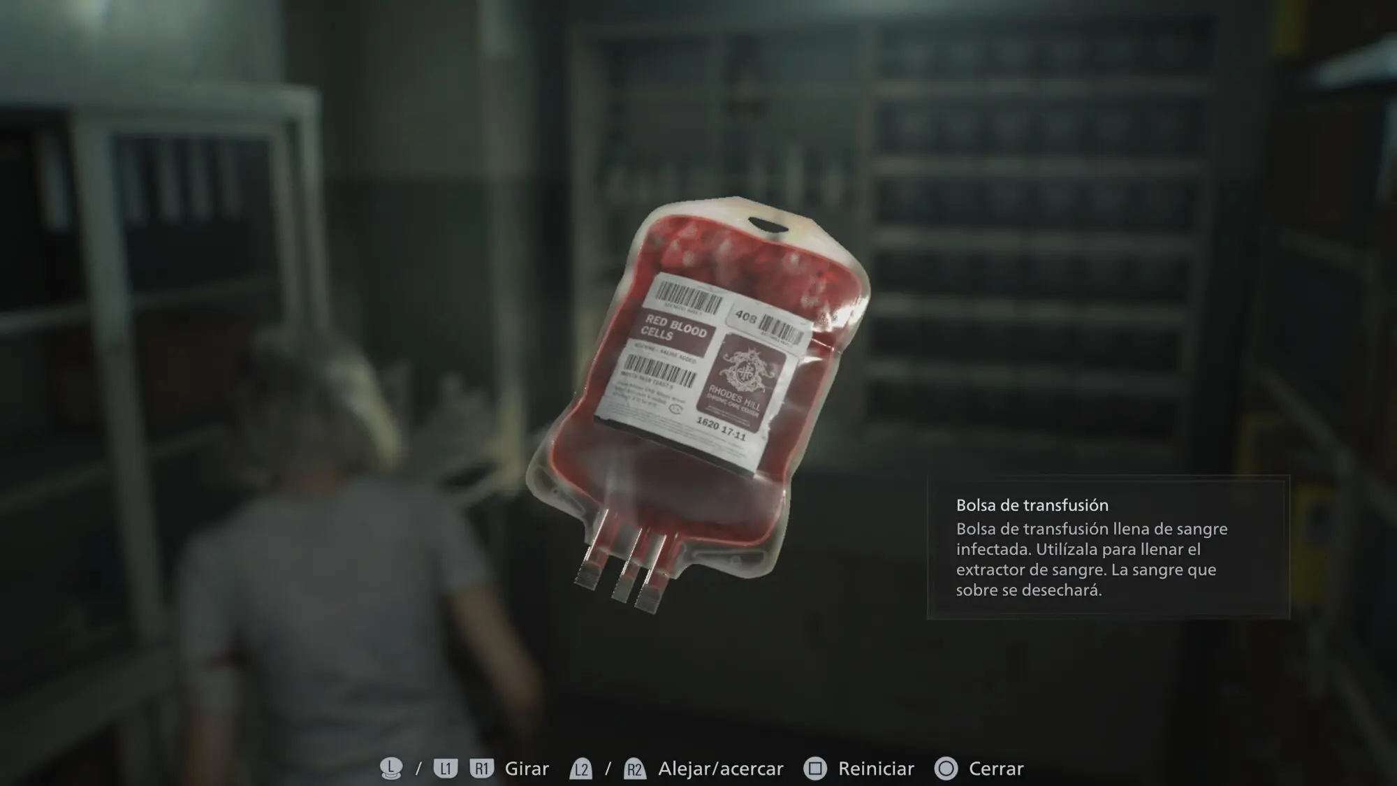 El segundo objeto es el Extractor de sangre — un dispositivo de análisis compacto con pantalla digital y tubo colector rojo, fabricado por Matsu Oka bajo la designación Blood Collector M-1500. Su función es extraer sangre infectada de cuerpos en el suelo para usarla como materia prima en la creación de objetos útiles. El tutorial lo deja claro: los charcos de sangre que Grace lleva encontrando desde que entró en Rhodes Hill no son decoración — son recursos. El extractor convierte esa sangre en inventario.