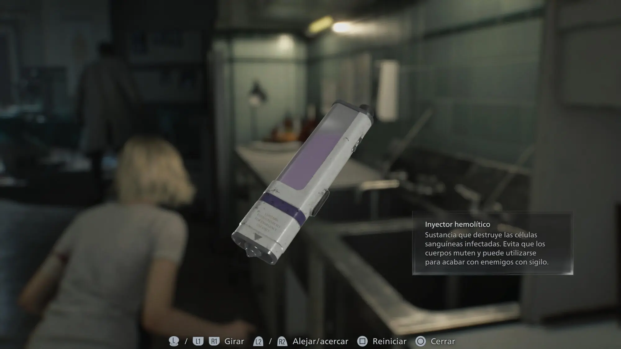 El tramo que sigue al primer cuarzo introduce dos mecánicas nuevas que van a definir cómo Grace gestiona las amenazas de aquí en adelante. El primero es el Inyector hemolítico — una jeringa industrial de cuerpo blanco con depósito morado y franja azul oscuro, diseñada para destruir células sanguíneas infectadas. La descripción del juego lo resume con precisión clínica: "Evita que los cuerpos muten y puede utilizarse para acabar con enemigos con sigilo."